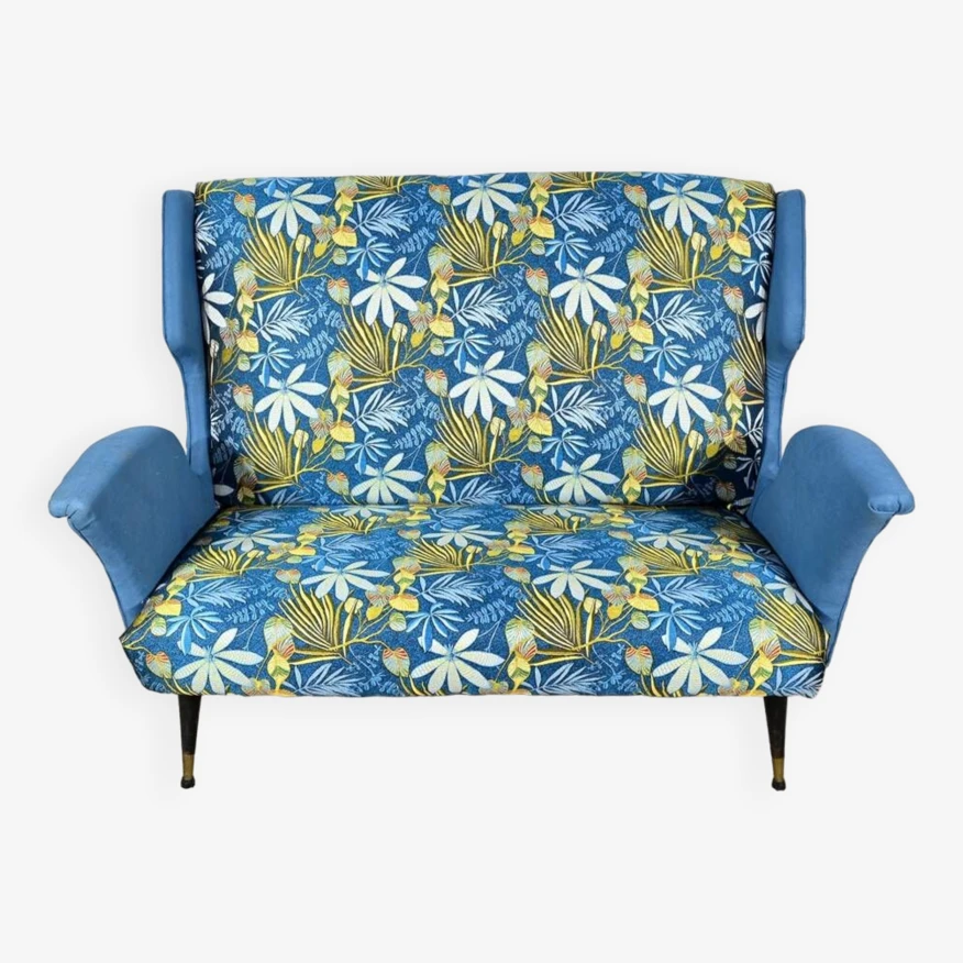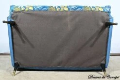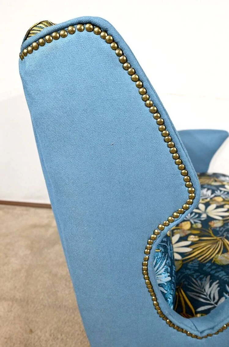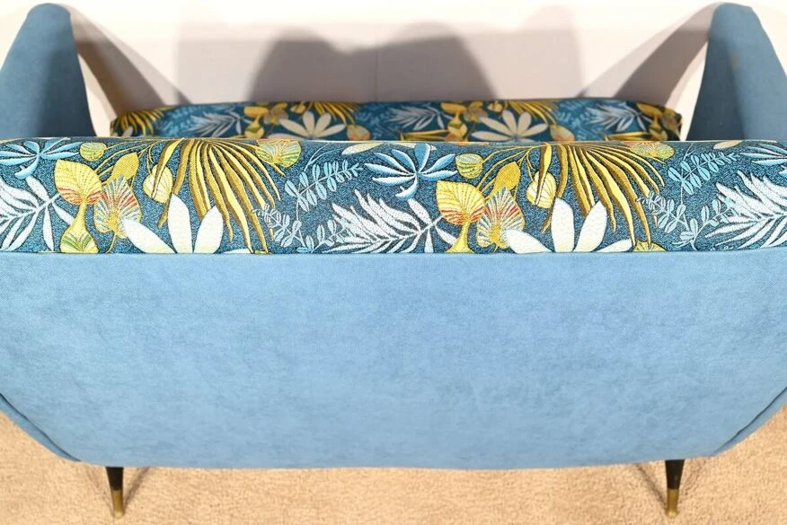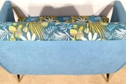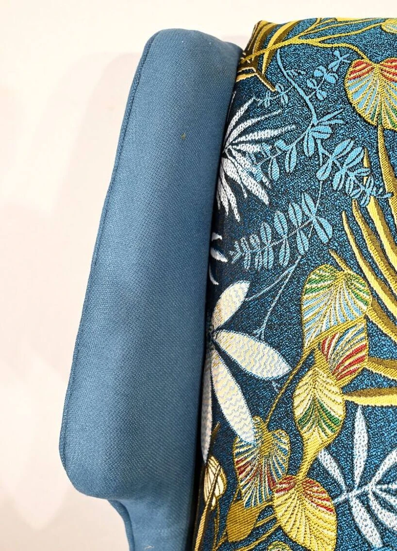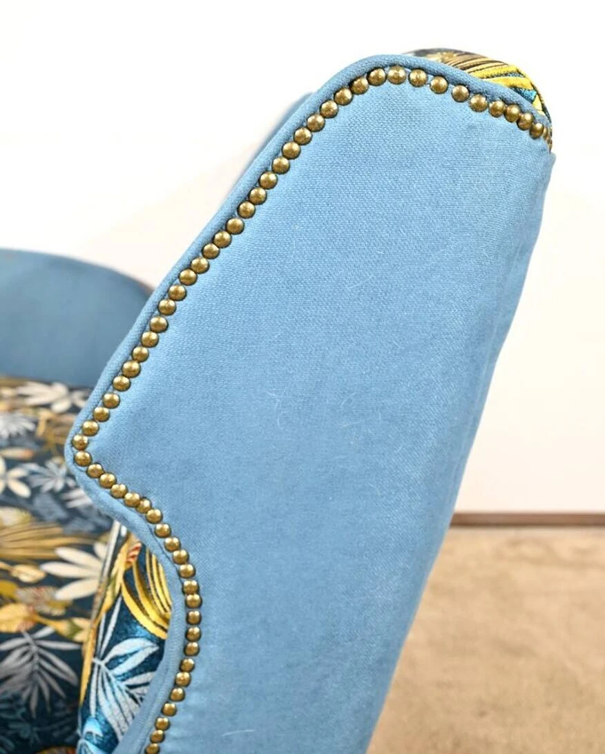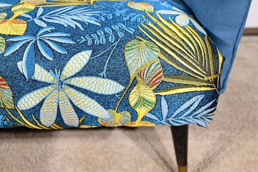 The seat and the large backrest are covered in a fabric patterned with tropical flowers on an azure blue background studded on the structure.