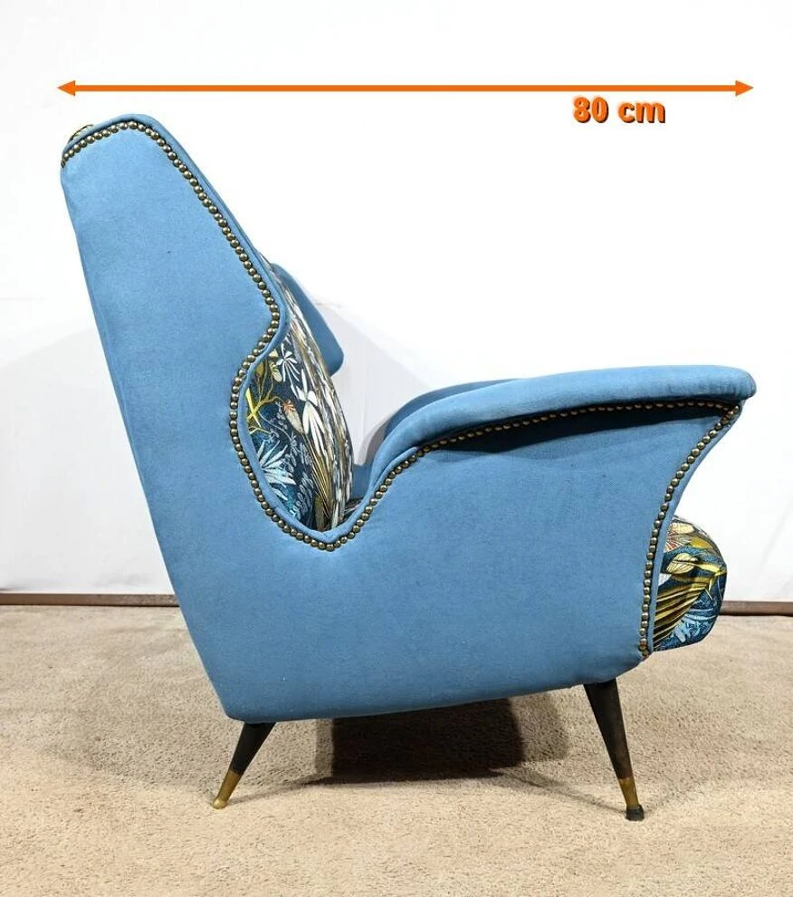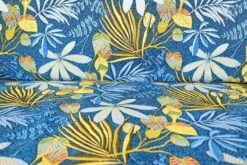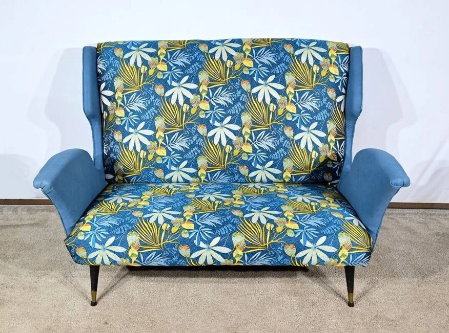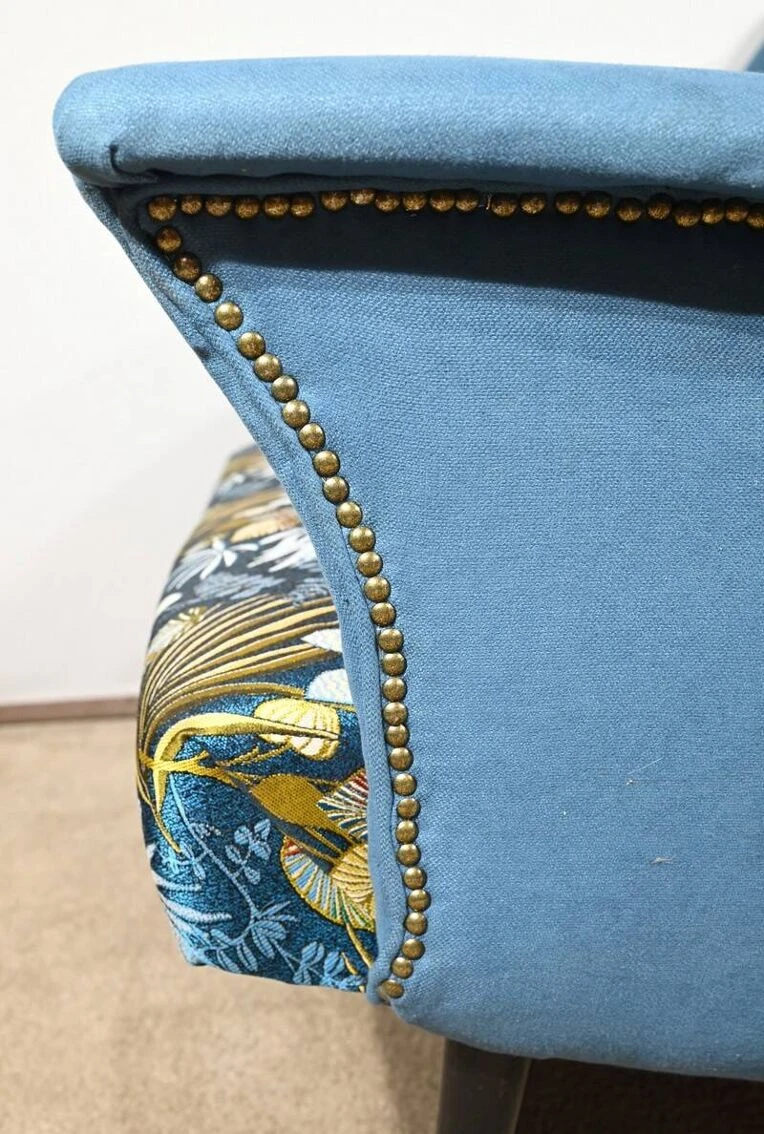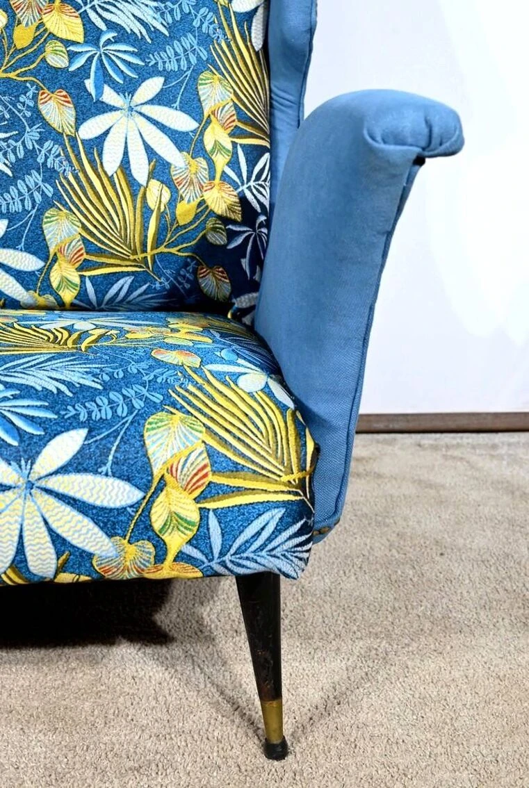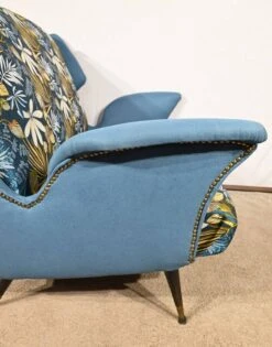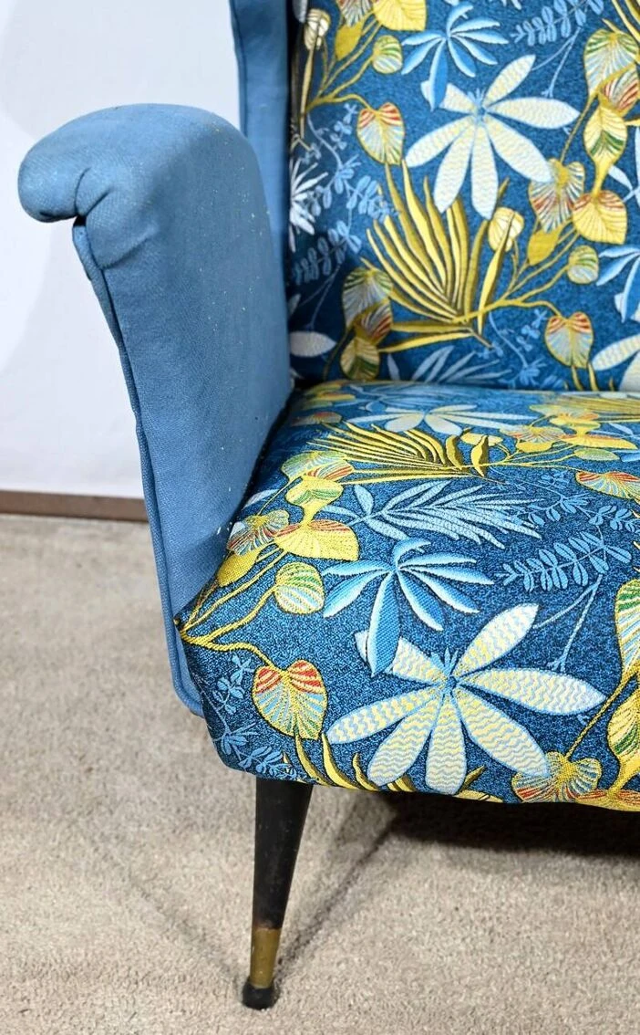 The seat and the large backrest are covered in a fabric patterned with tropical flowers on an azure blue background studded on the structure.