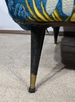 This two-seater bench rests on four thin blackened wooden legs decorated with a brass element.