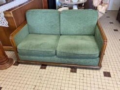 2-seater sofa in wood and green velvet. Cherry frame. Covers and covering in green velvet, covers removable with zipper. Seat with straps covered with a veil of black fabric. Good condition, comfortable and firm seat. Dimensions: 146 X 87 X 87 cm, seat height 42 cm. Weight 40 kilograms.