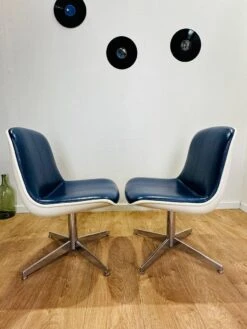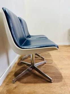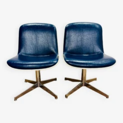 Duo of strafor chairs (made in France 🇫🇷) Typical of the 70s: chrome star legs, white molded plastic shell and seat/back in a single part which is all in blue skai. You can see the excellent general condition of these beauties. Sometimes vintage has great surprises in store for us. And here we have proof. 🥰😍💙 This duck blue is absolutely sublime. And I’m not even talking about comfort… You’ve understood: these two chairs are rare gems. Do not miss. Here are their dimensions: H backrest 73cm. H seat 43cm. L 55cm. D 45cm.