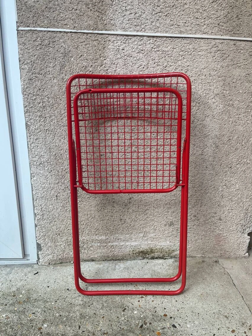 Designer – Niels Gammelgaard. Producer -ikea. Model – ted net chair. Design period – 1980. Measurements – width 45 cm X depth 45 cm X height 77 cm X seat height 43 cm. Materials – metal. Red color. Wear consistent with age and use. Good condition.