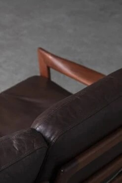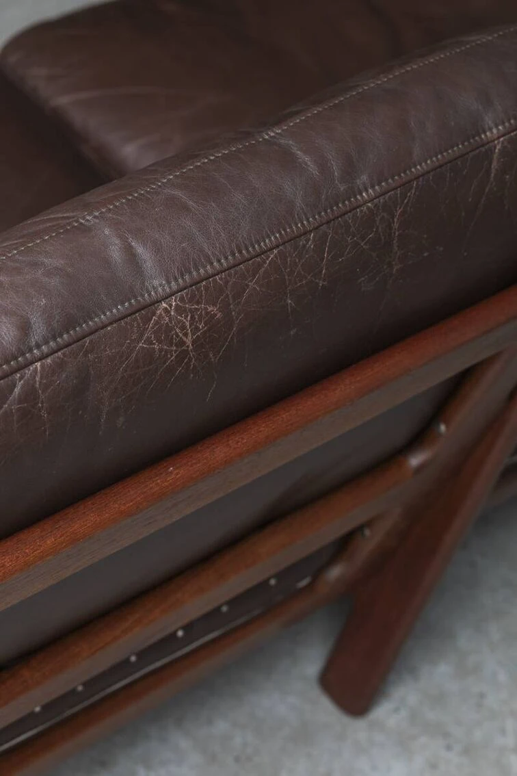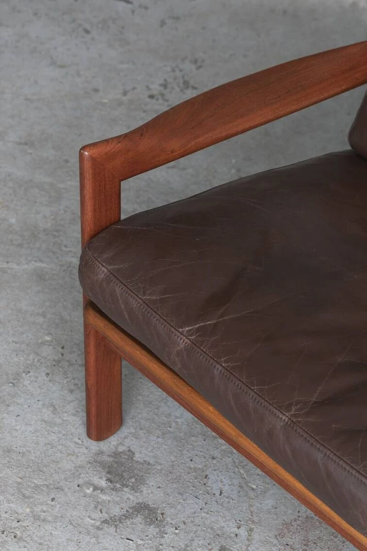Solid teak frame garnished with pillows upholstered in the original leather.
