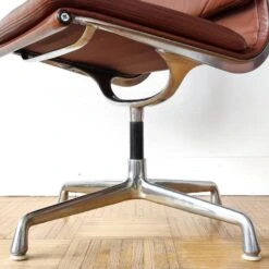 Here is a very beautiful series of 4 Soft pad EA406 (swivel) office chairs in brown leather by Charles and Ray Eames, Herman Miller edition, 1970. This is the iconic Soft Pad EA 406 (swivel) office chair in brown leather produced by Herman Miller in the early 1970s. This model is a great classic of the office chair with its cast aluminum structure resting on 4 star-shaped legs and its seat made of a strong canvas on the back on which A beautiful brown leather skin is sewn on the back. The chair is in very good general condition with a beautiful patina of time on the leather which is neither torn nor holed and which has been nourished. The aluminum structure was also polished to restore its former appearance. The original labels are present and the serial number cast in the aluminum as well. Dimensions: H84 x L52 x D54 Seat height: 46cm
