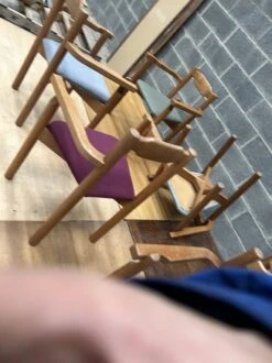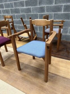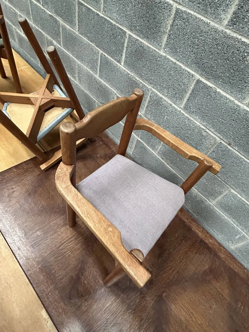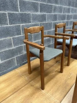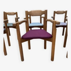 Rare set of 6 dining room chairs in Oak and Mohair by Guillerme and Chambron, perfectly stable structure, correct seat fabric, consistent with their age Guillerme & Chambron for Your Home, set of eight dining room chairs, oak, reupholstered in mohair, France, 1960s This rare set of armchairs was designed by the French designer duo Jacques Chambron and Robert Guillerme. These chairs feature the signature frame of this French designer duo: well-made, solid and sculptural. Each element is sculpted masterfully. The frame consists of four cylindrical-shaped legs onto which the subtle, curved armrests are attached. The seat has beveled edges and is reupholstered in a complementary off-white mohair tinged with beige. The French designer duo Jacques Chambron (1914-2001) and Robert Guillerme (1913-1990) began production after the war. Robert Guillerme studied design and architecture at the École Boule and graduated first in his class in 1934. In the meantime, Jacques Chambron graduated from the School of Applied Arts in Reims. During World War II, the two men met in a stalag, a Prussian prison camp, while imprisoned by the Germans in East Prussia, and struck up a great friendship based on their intense and deep passion for the interior design. In 1948, Chambron resigned from his job as a painter and decorator on Rue Nollet in Paris to settle in Lille, in the North of France and join Guillerme. A year later, they met the cabinetmaker Émile Dariosecq, owner of a workshop nearby. It was during this meeting that they decided to create their own business. They named it “Votre Maison”, meaning “your home”, which became the soul of the company. They wanted to create pieces focused on functionality combined with beautiful design