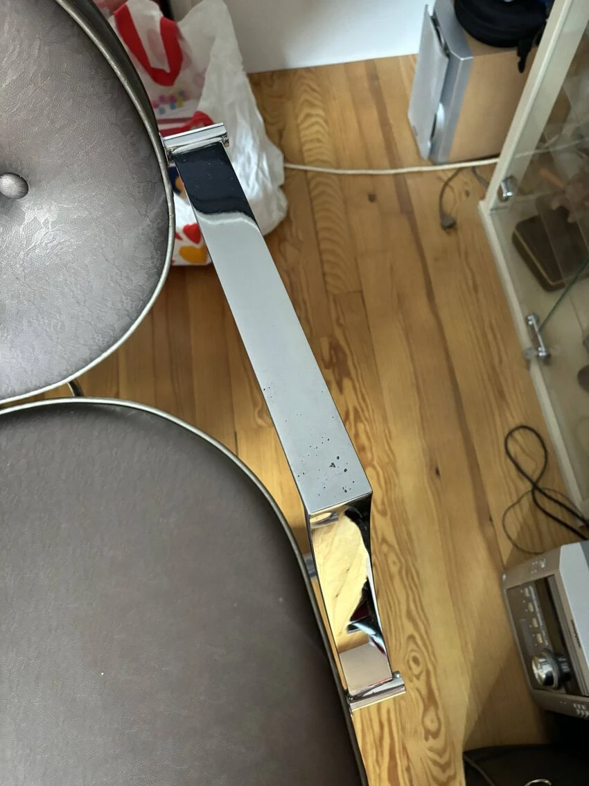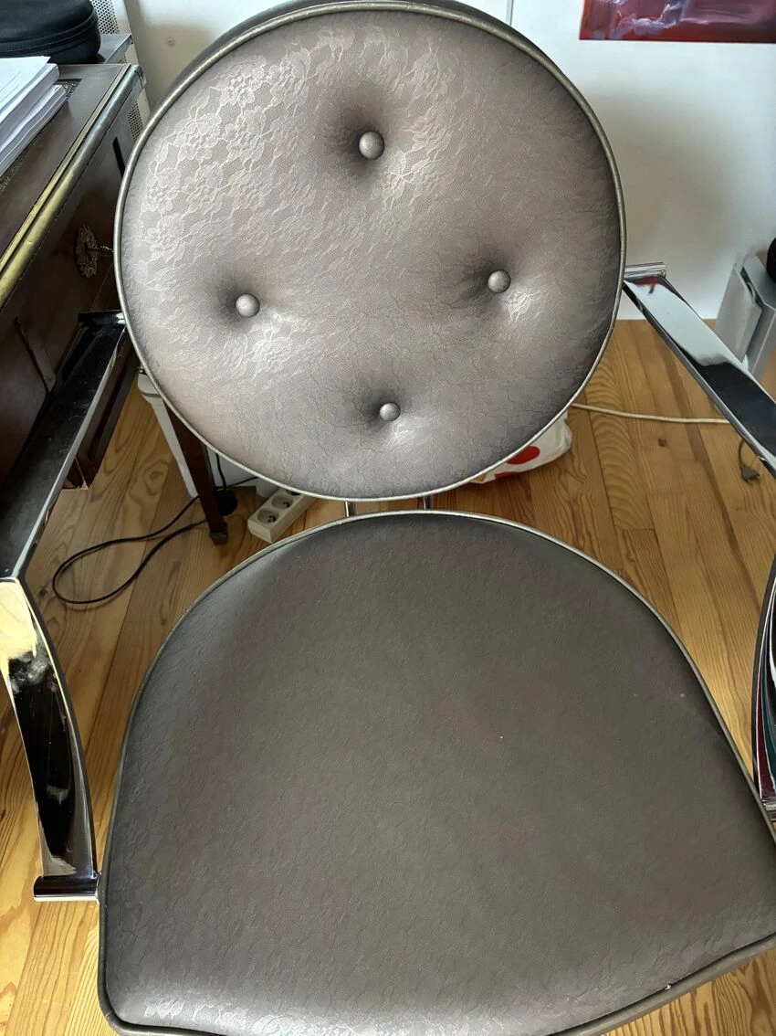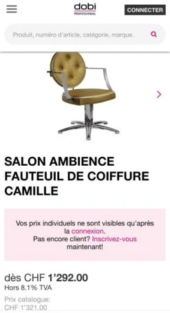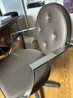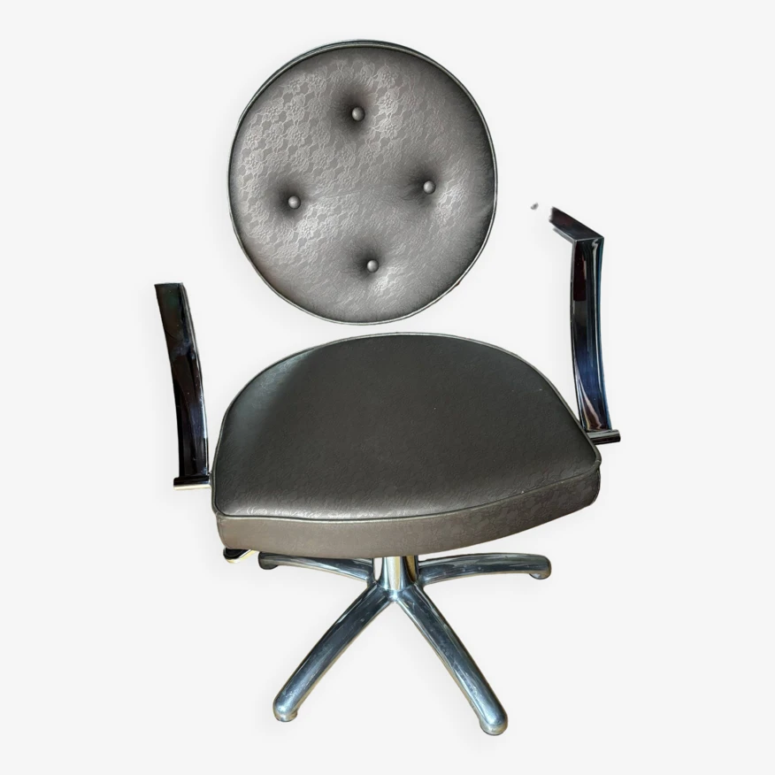 Hairdresser’s chair made in Italy from the salon ambience brand. Very good state. This luxuriously designed hairdressing chair seduces with its round padded backrest and chrome armrests. Thanks to its comfortable, high-quality padding, it offers seating comfort. Hydraulic pump. Leatherette. Slight dents on the left chrome armrest. Height 83cm to 97cm. Seat height 43 to 57cm. List price around €1300 excluding tax.