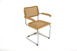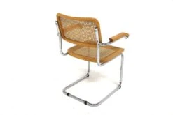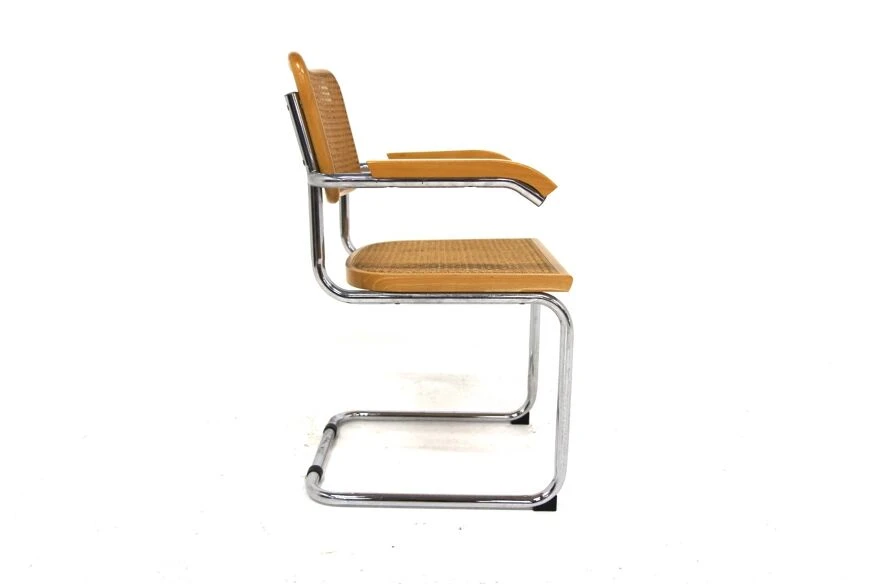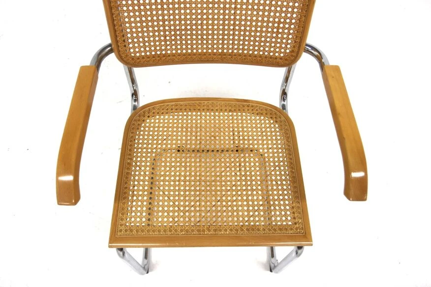 Tubular structure in chrome steel and solid beech. Canework seat and back. Re-edition from the 1990s. Stamped “made in Italy” and numbered. Excellent condition, stable and very comfortable with minimal traces of wear. A “must have” in furniture design. Height. seat. 46cm. 25996