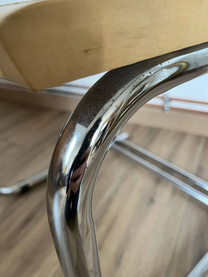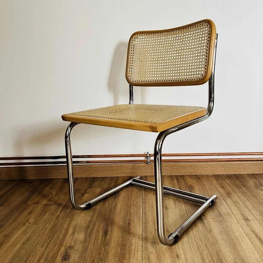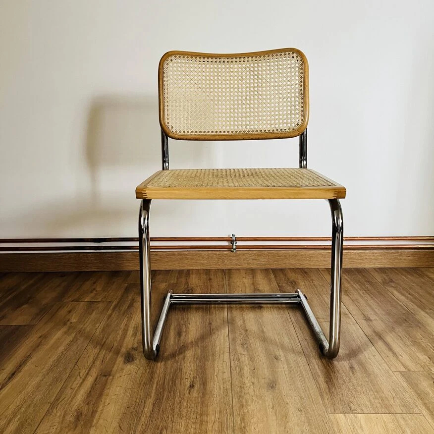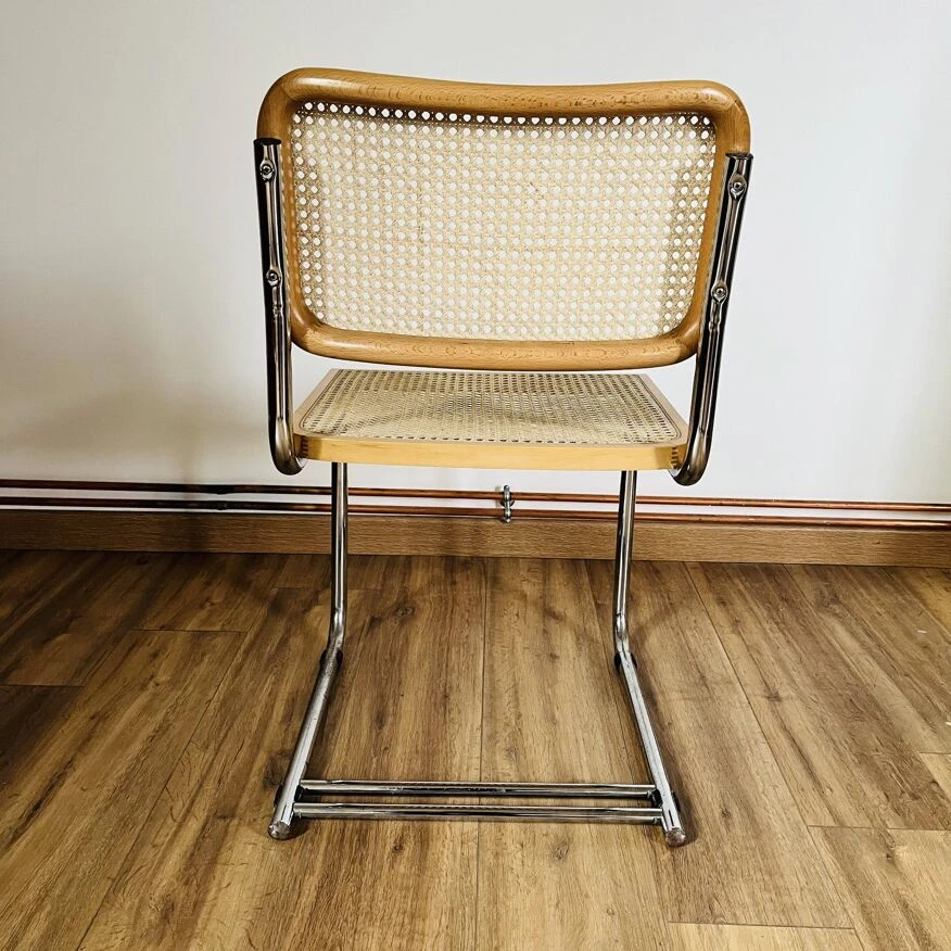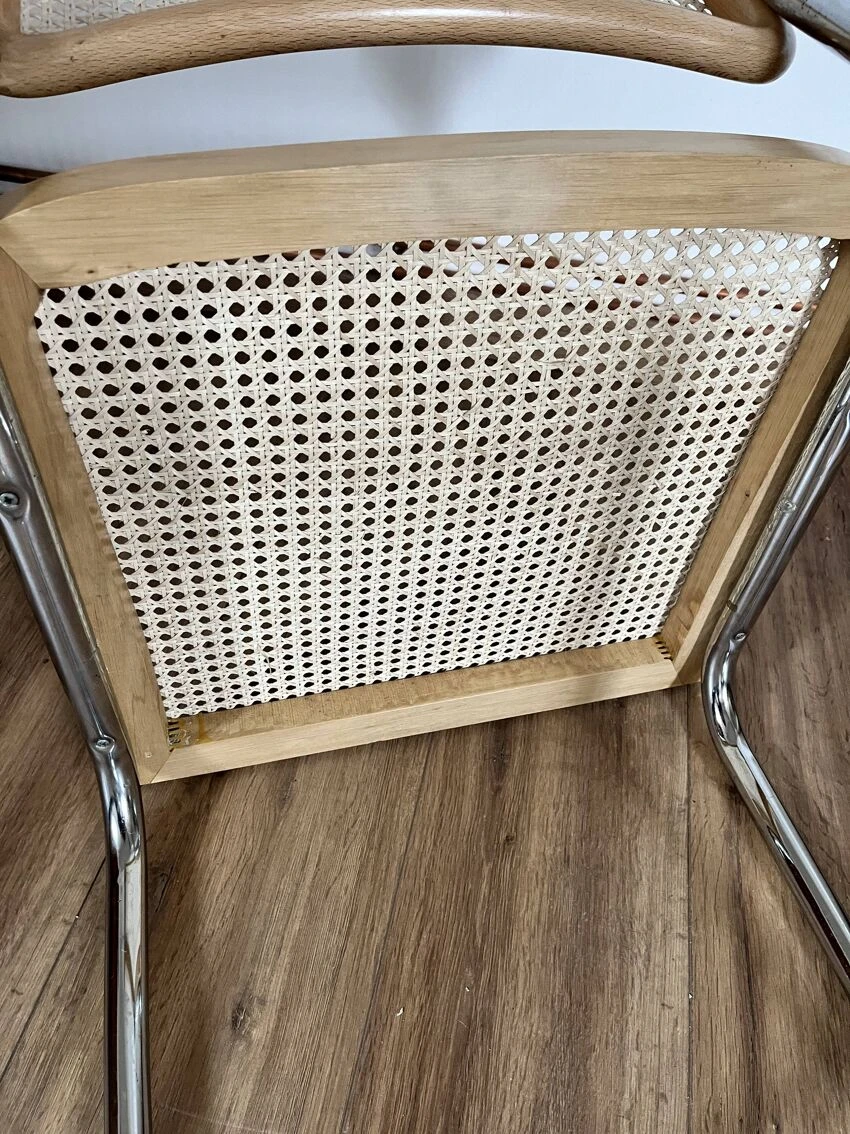 Cane design chair made in italy b32 by marcel breuer with a particularity: the double leg – uncommon – tubular structure in chrome steel – canework in good general condition – marks & traces of time and use including scratches, dents, pitted chrome and presence of traces of rust in places, a few damaged strands which do not call into question the solidity of the chair – beautiful patina – good general condition – {seat height: 45cm – seat depth: 43cm – height: 82.5cm – width: 46cm – depth: 46cm} – delivery possible|contact us.