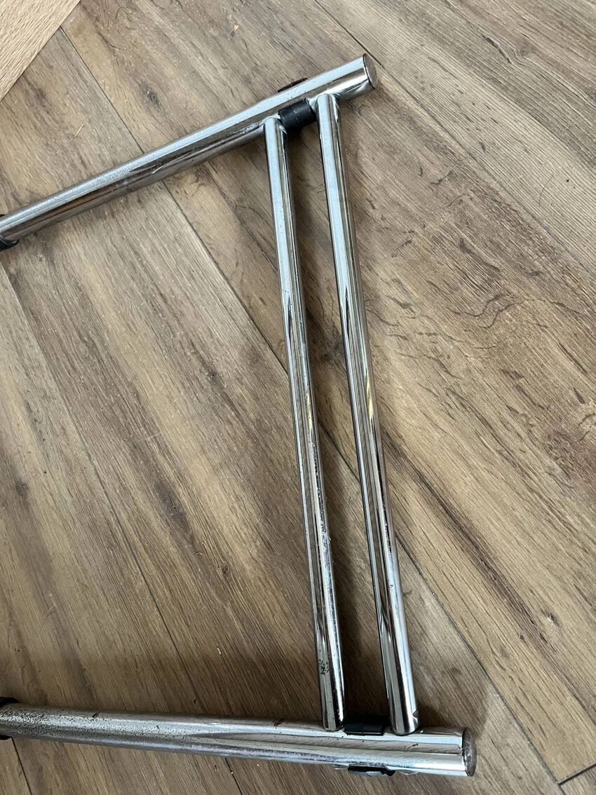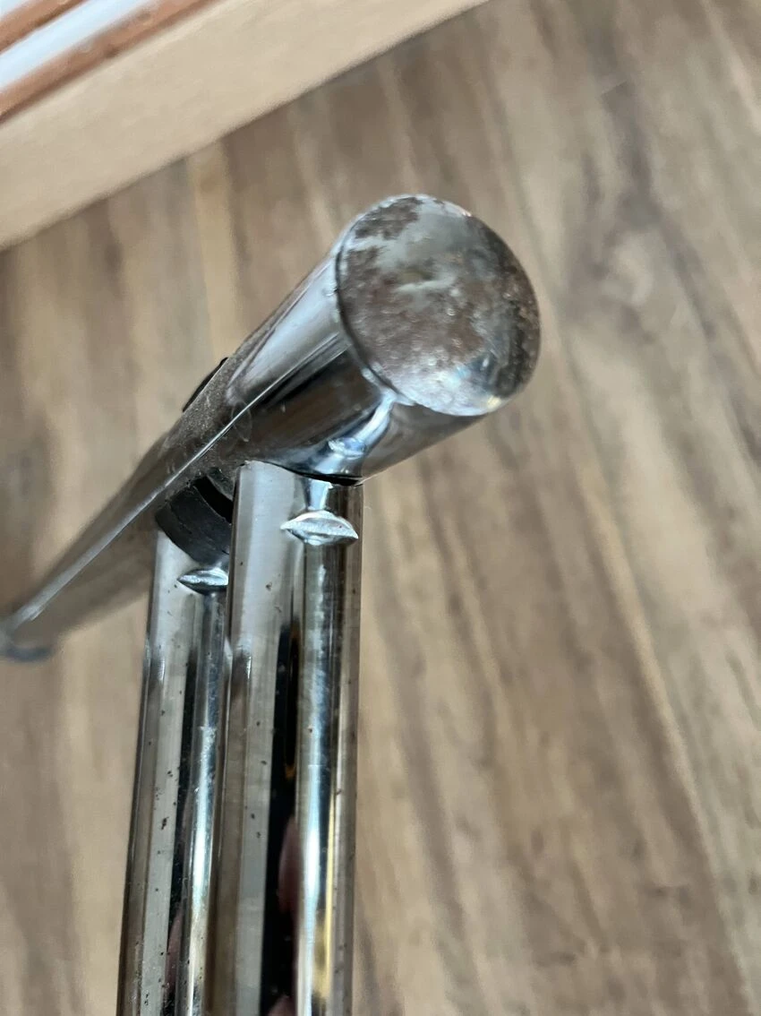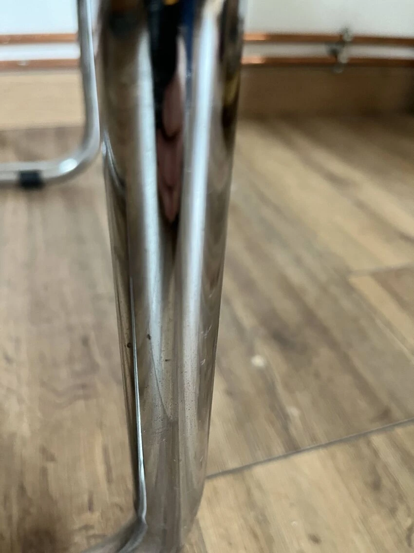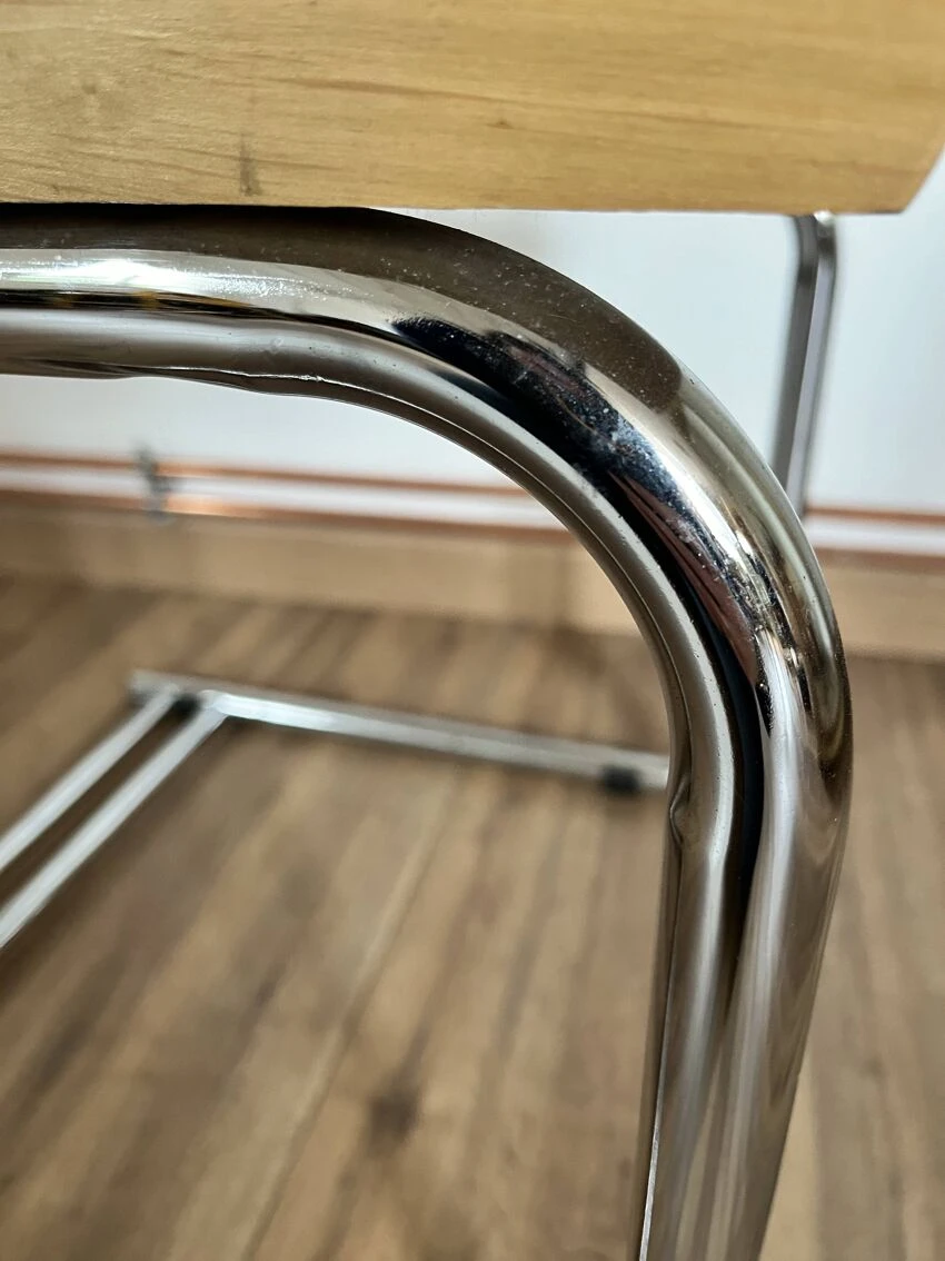 Cane design chair made in italy b32 by marcel breuer with a particularity: the double leg – uncommon – tubular structure in chrome steel – canework in good general condition – marks & traces of time and use including scratches, dents, pitted chrome and presence of traces of rust in places, a few damaged strands which do not call into question the solidity of the chair – beautiful patina – good general condition – {seat height: 45cm – seat depth: 43cm – height: 82.5cm – width: 46cm – depth: 46cm} – delivery possible|contact us.