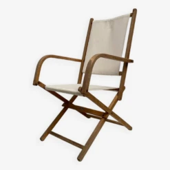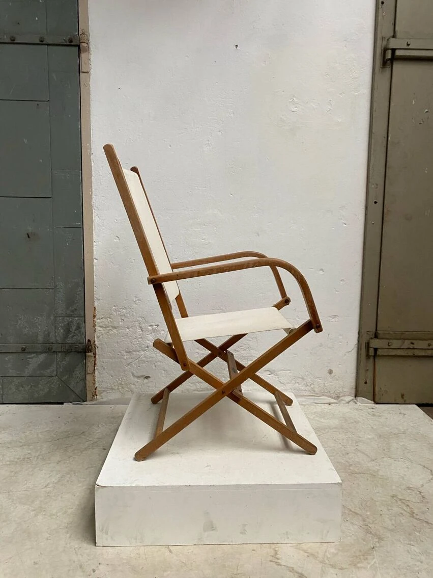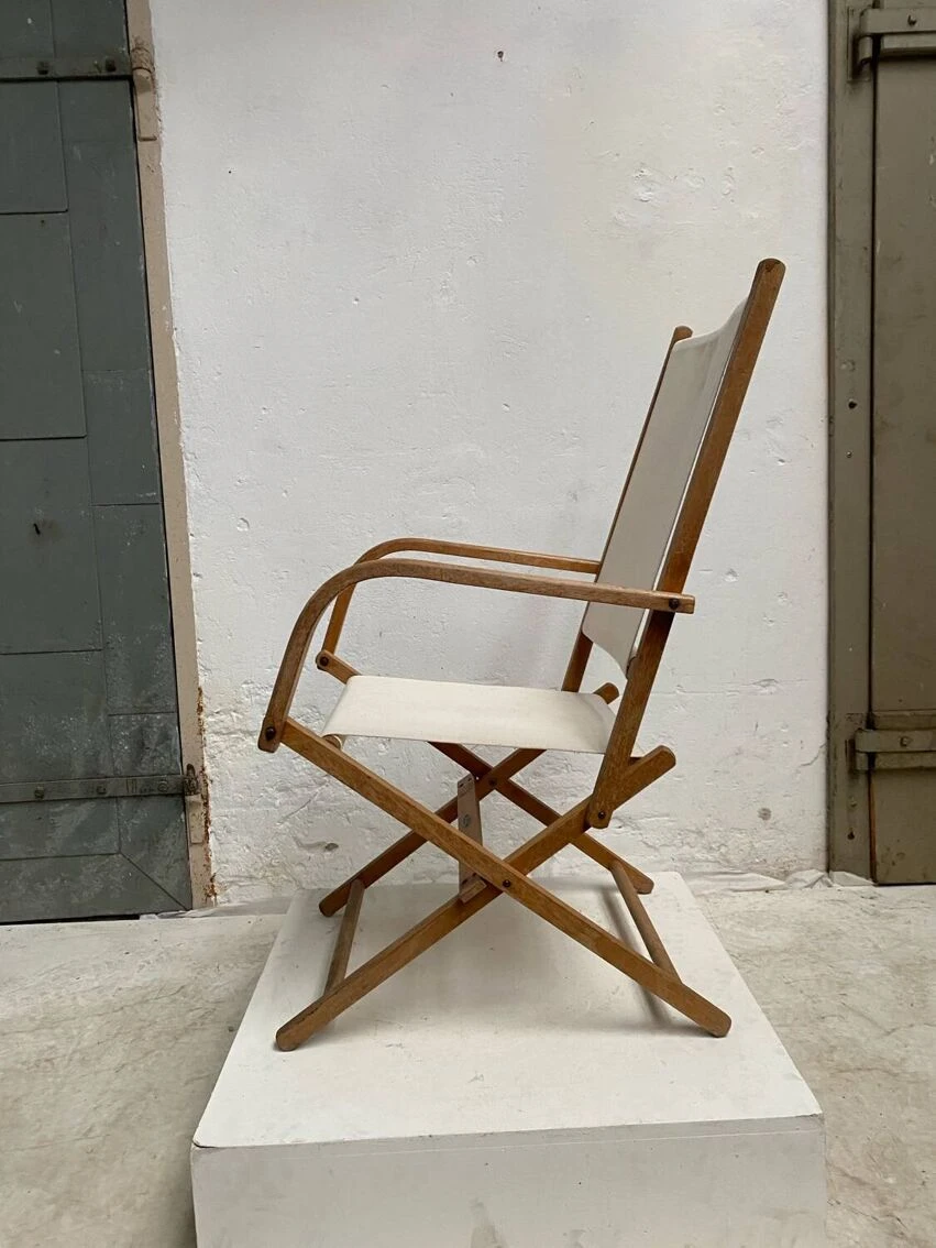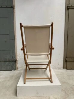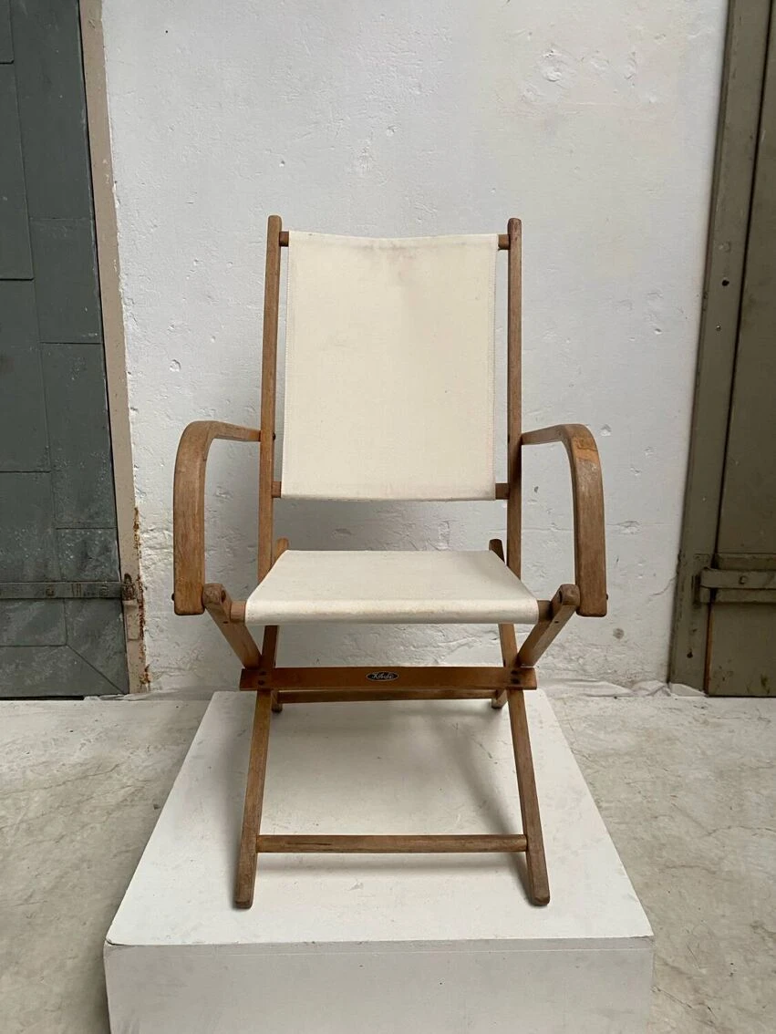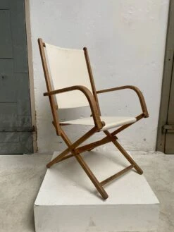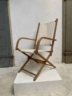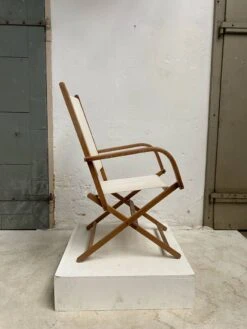 Chaise pliable de la marque néerlandaise Kibofa en bon état général. Nous lui avons récemment donné une nouvelle toile. Quelques taches sont visibles sur la toile, il est sans doute possible de la nettoyer. Dimensions (cm) H 92. Sièges h 41. L 54, 5. P 50. Sièges d 43.