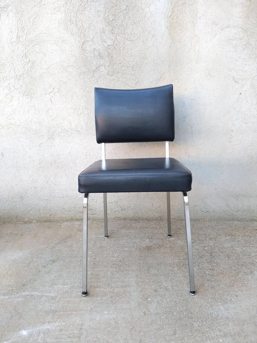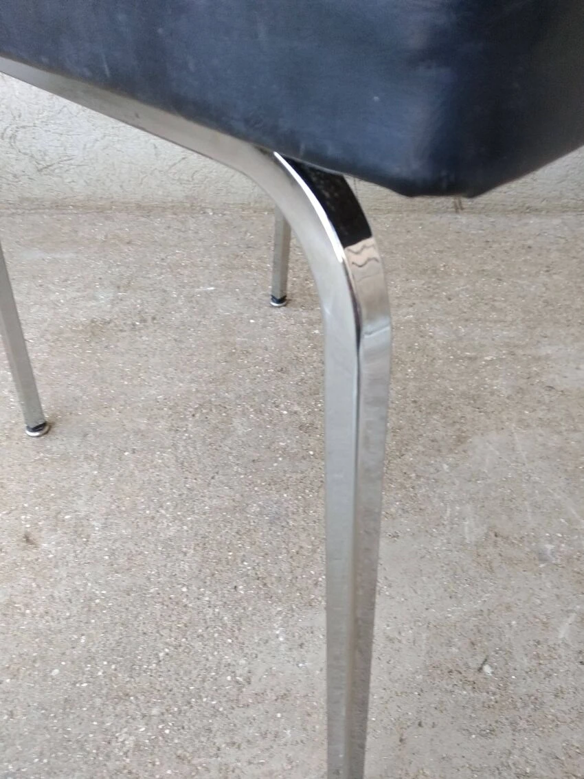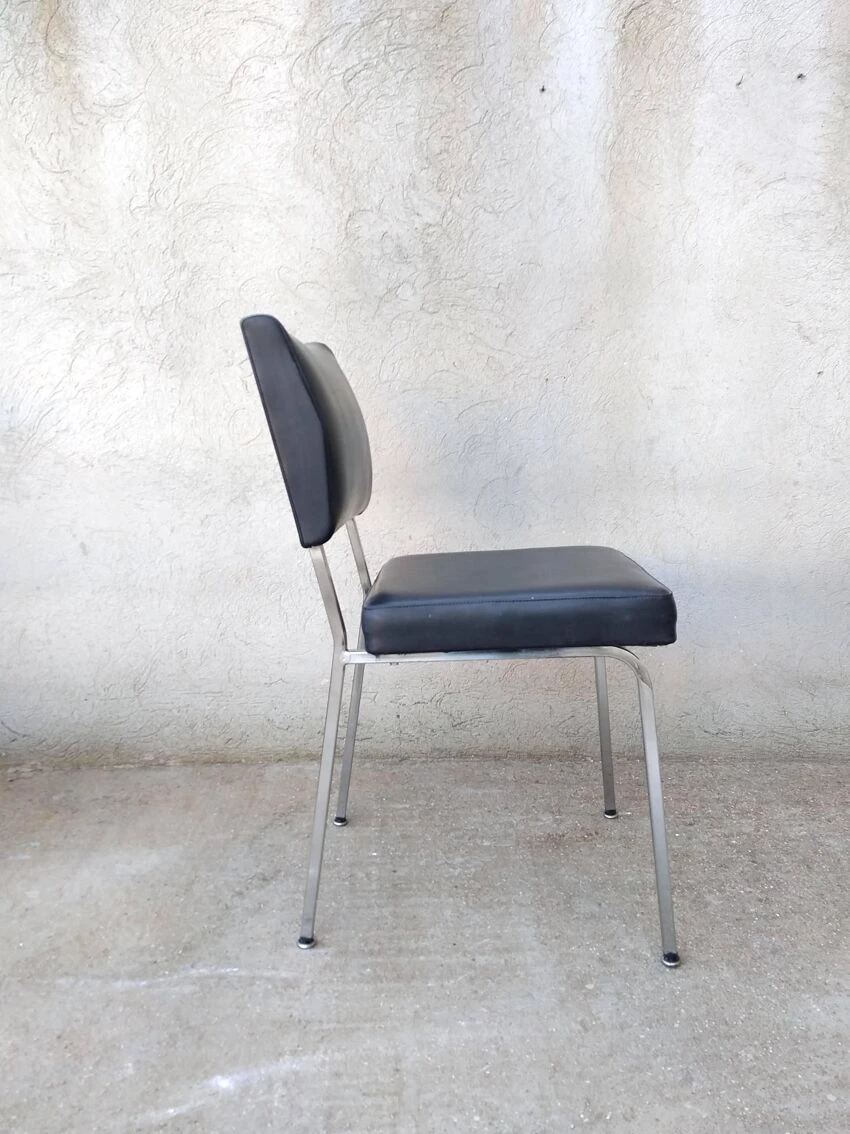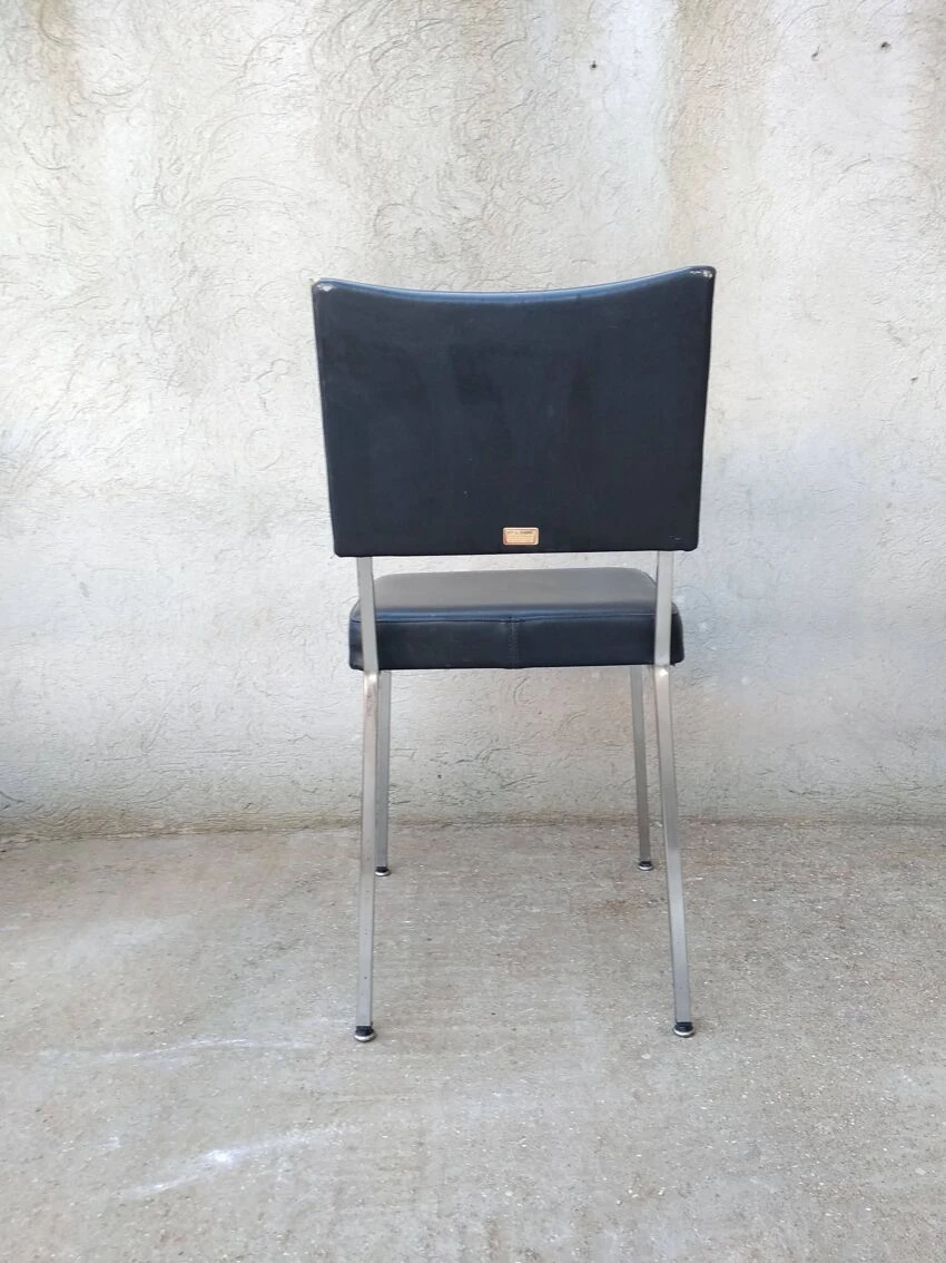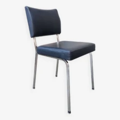 Office chair from the 60s. Square tubular chrome base, seat and back covered in black imitation leather. Good general condition with wear and tears on the covering which could possibly be easily replaced. The structure is in good condition, very slightly pitted. Small label on the back with name and address of the distributor: ets l.fabre 76 bld de strasbourg toulon. Seat at 45 cm.