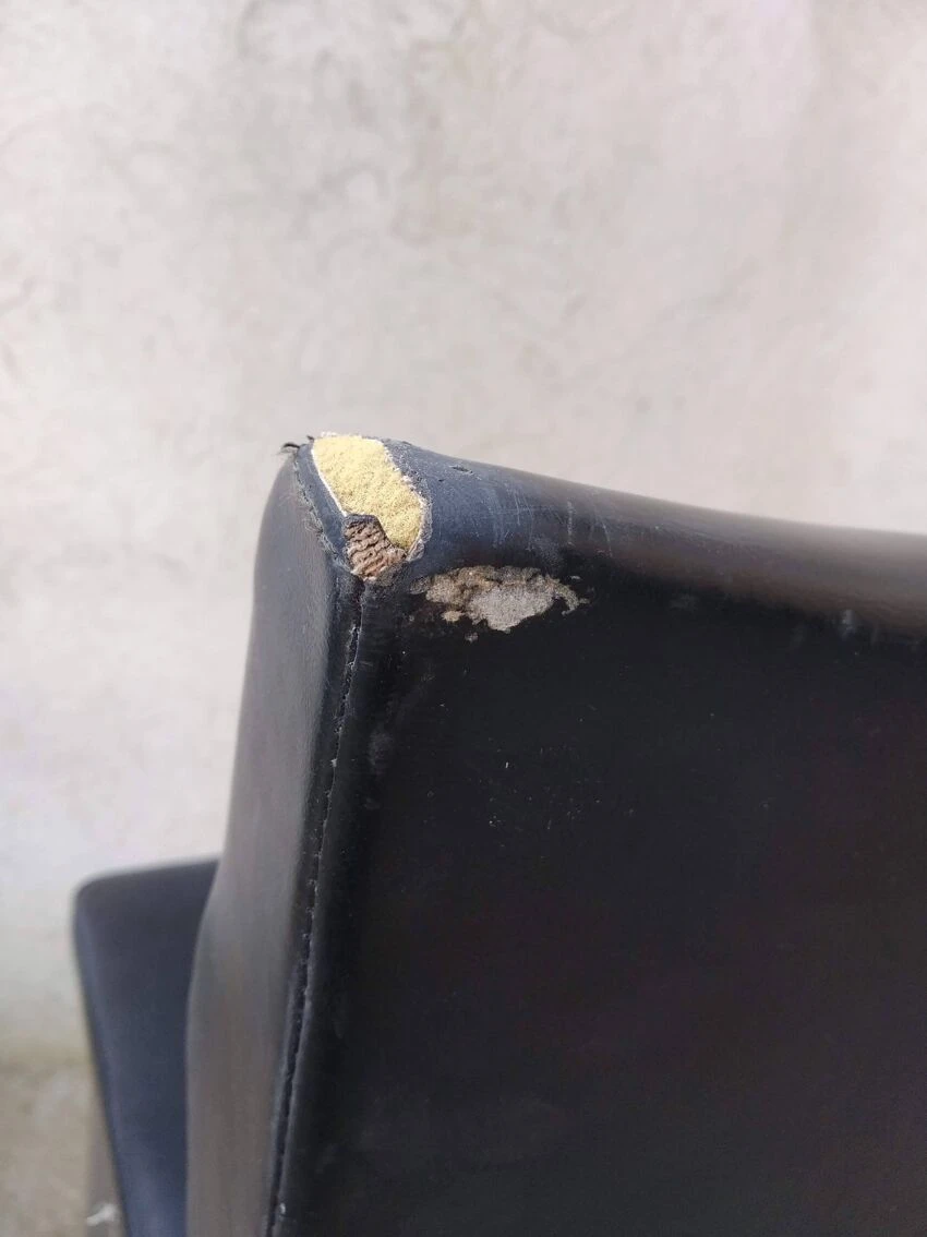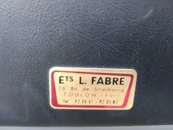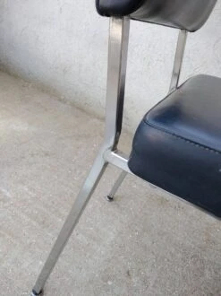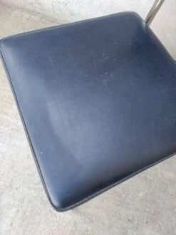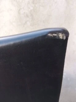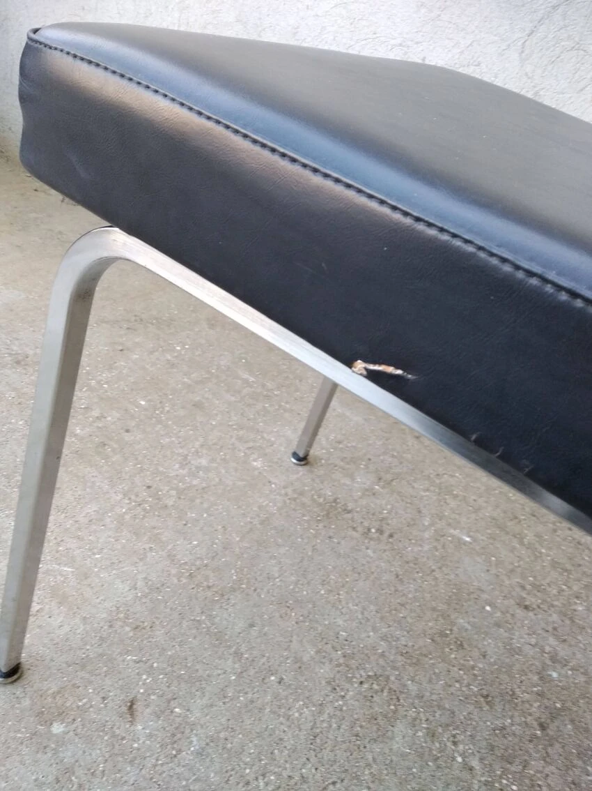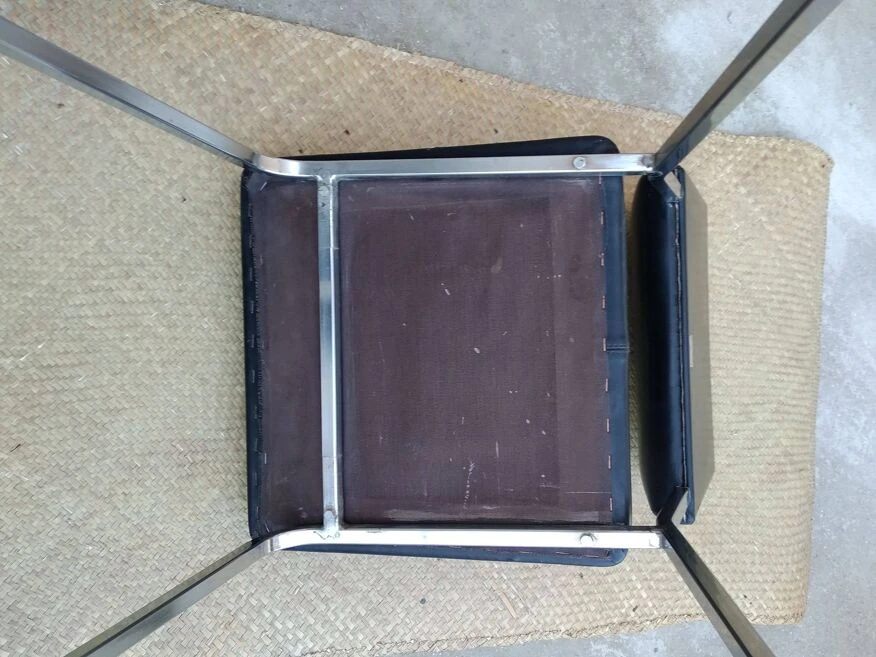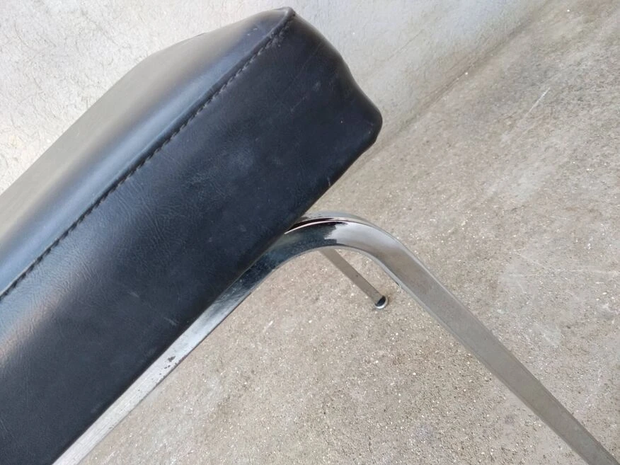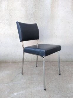 Office chair from the 60s. Square tubular chrome base, seat and back covered in black imitation leather. Good general condition with wear and tears on the covering which could possibly be easily replaced. The structure is in good condition, very slightly pitted. Small label on the back with name and address of the distributor: ets l.fabre 76 bld de strasbourg toulon. Seat at 45 cm.