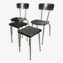 Lot of vintage formica chairs and stools. Little seen model in black and pink marble style. 2 chairs and 2 stools. Multiple traces of corrosion on the metal parts of the chairs.
