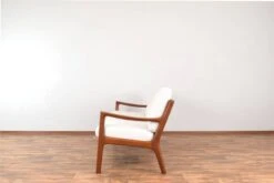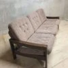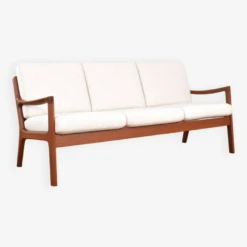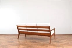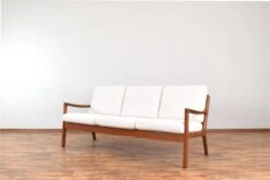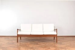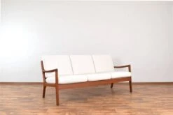 This teak sofa model Senator was designed in the 1950s by the Danish designer Ole Wanscher and produced in the 1960s by Cado. The sofa frame is made of solid teak and is in original, almost perfect condition. Only the armrests have been slightly renovated. The pillows have been reupholstered with a beige fabric made of a mixture of linen, cotton and viscose, resembling in its texture the materials originally used in the 1960s.