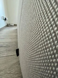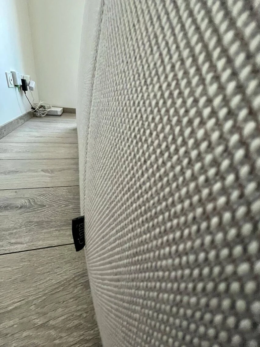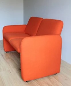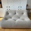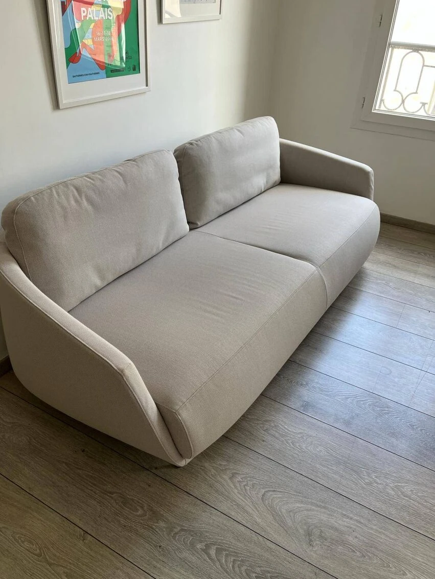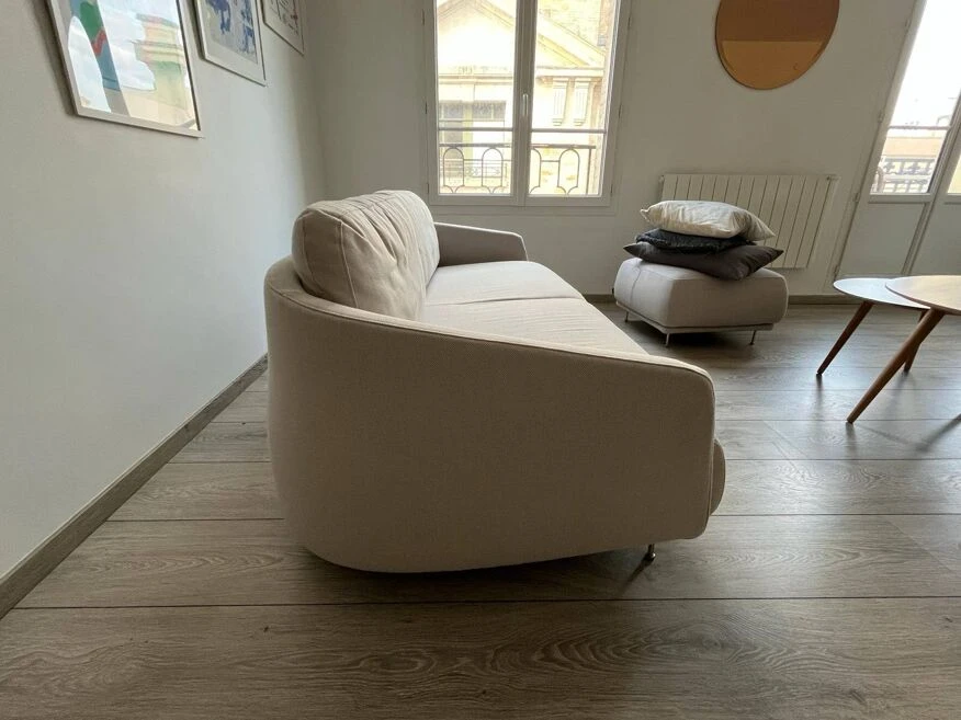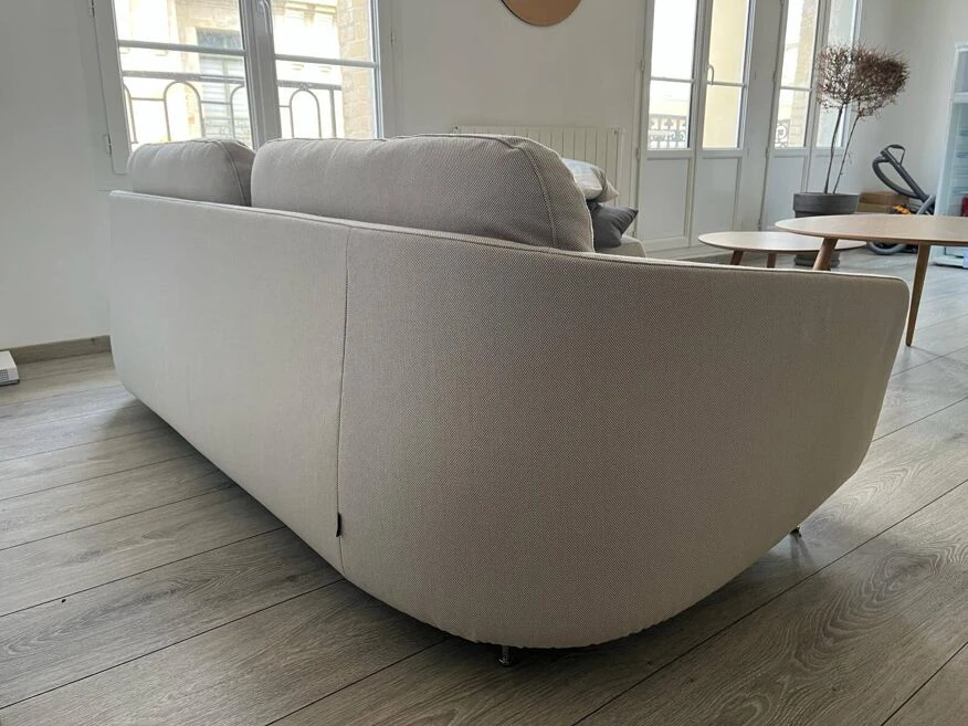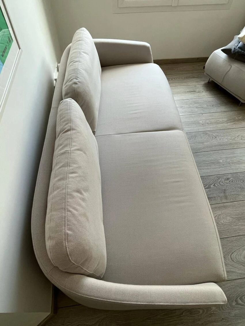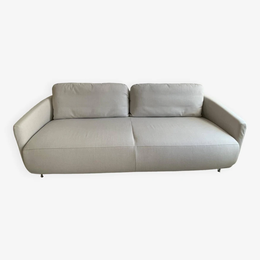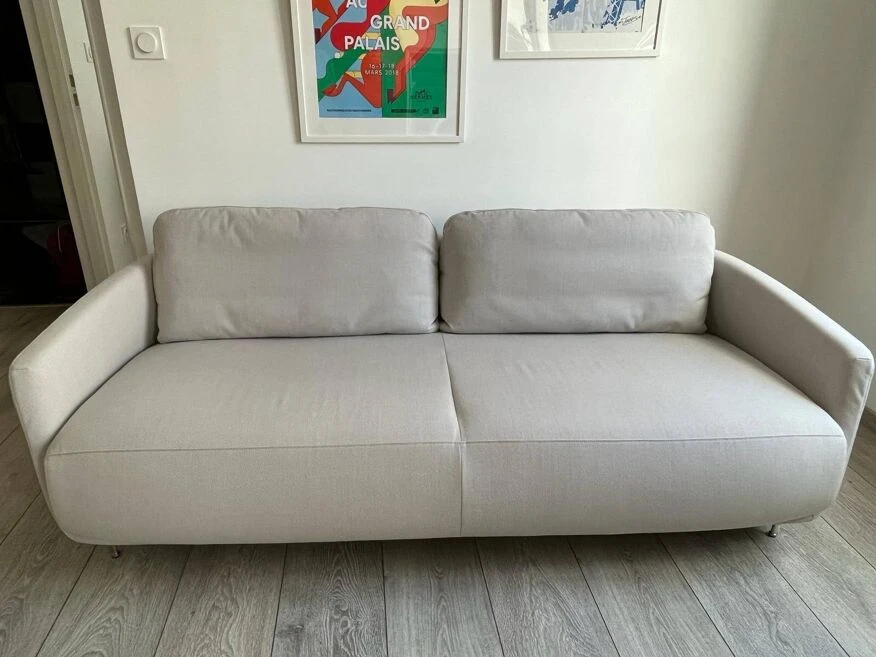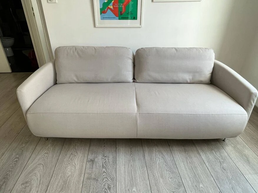 This is the okura model. – 2 large seats – low back with removable cushions – height: 73 cm – width: 202 cm – depth: 98 cm – seat height: 40 cm – steelcut trio fabric no. 205 greige (three threads: gray, white and beige) – 90% virgin wool – base: shiny chrome steel – new value (delivered february 2017): €3, 981 invoice available.