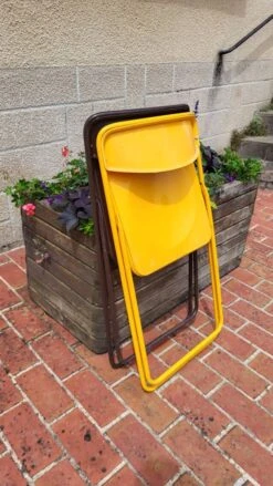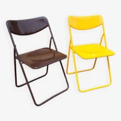 Pair of 80s Ted net folding chairs by Niels Gammelgaard / vintage ikea. Yellow & brown lacquered tubular structure / plastic seat and back. Traces of use and age. (micro scratches and some paint chips) Dimensions: h76 x l45 x p46.