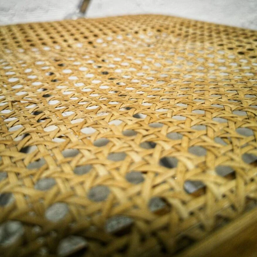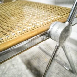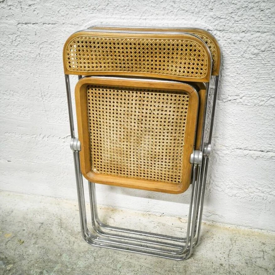 With its 5cm thickness when folded, the plia chair has become an icon of Italian design. The chair folds easily thanks to the ingenious three-ball joint. The back and seat of the “plia cane” version are made of wood and Vienna straw cane, the structure is made of chrome-plated steel. This cane version is a fairly rare model, which is part of the moma’s permanent exhibition. The chrome of the structure has been deoxidized but traces of oxidation and chrome breaks are present (visible in the photos). Furthermore, the canework of the seat is a little distended. Seat height 44cm. Folded dimensions: 47x89x5cm.