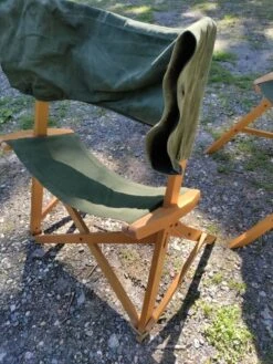 The frame of the chair is made of beautiful light brown wood, while the seat and back are made of durable canvas in a dark green color.