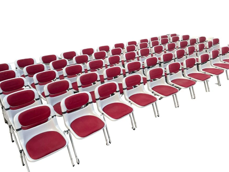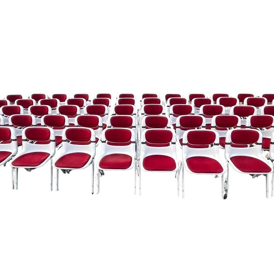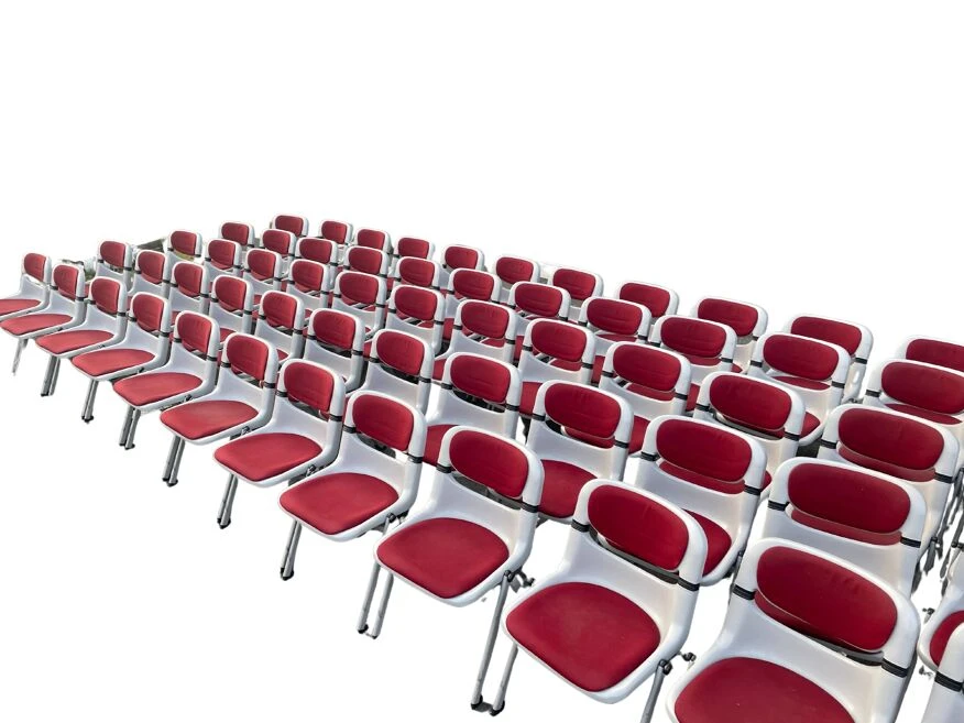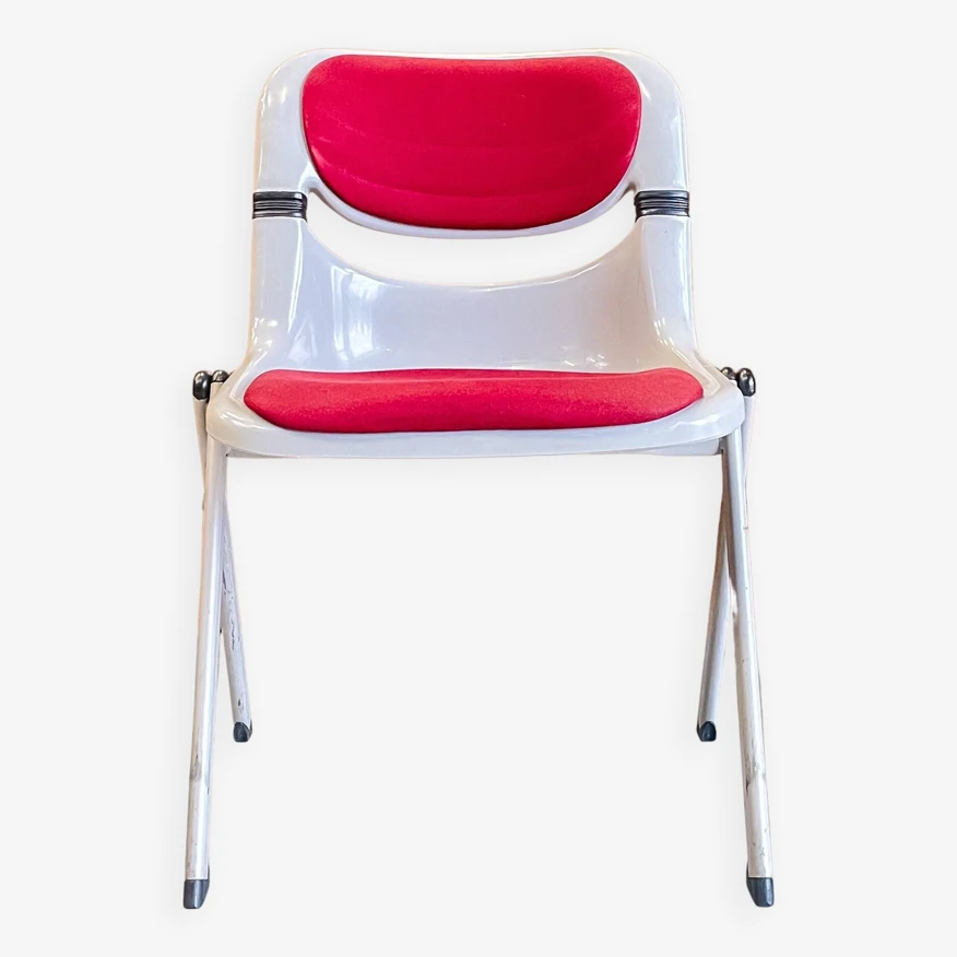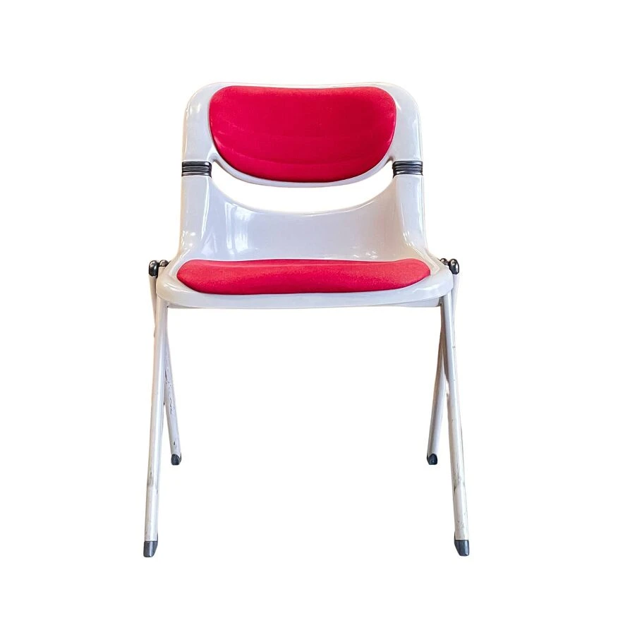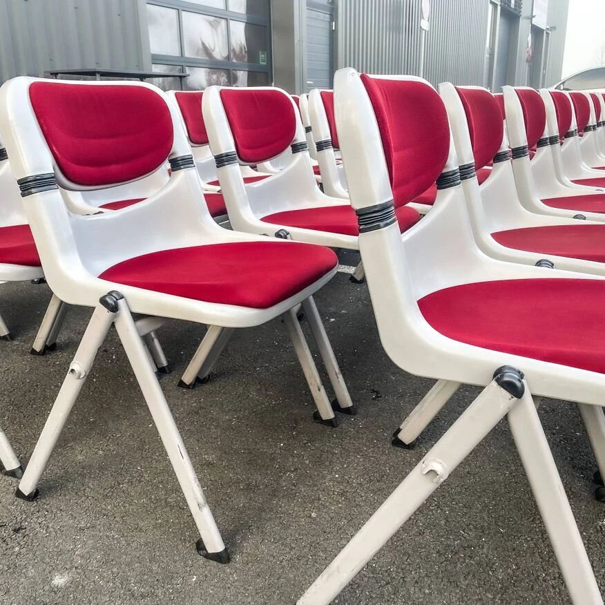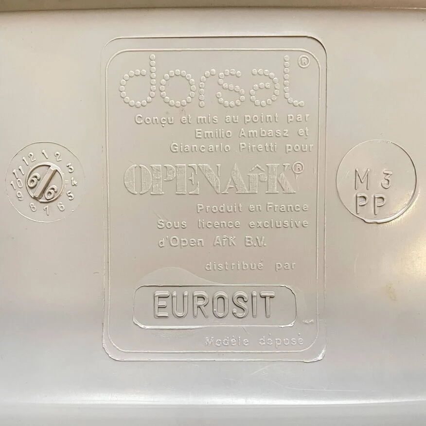 Set of mid-century style “dorsal” model office or conference chairs, designed in 1980 by Emilio Ambasz and Giancarlo Piretti for the Italian company Openark. The chair frame is a combination of steel and plastic, the upper half of the backrest is spring-loaded and can be rotated. The chairs are stackable and are in very good condition, showing signs of use on the plastics and legs. The fabrics are in excellent condition. Origin: Loire Valley community.