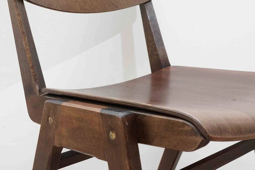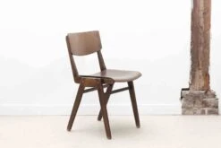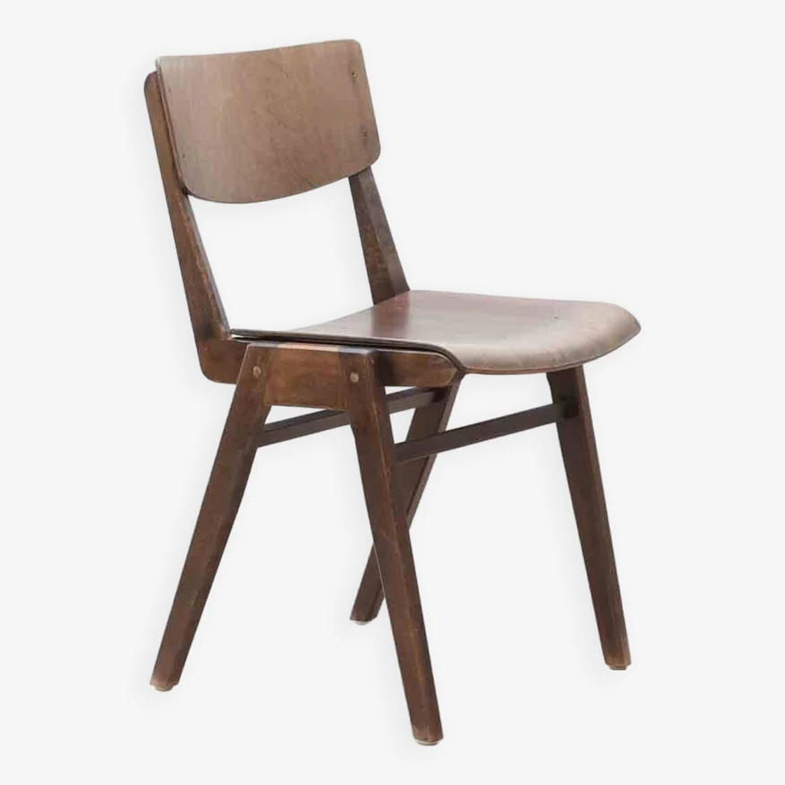German ebony-colored wooden chair from the 60s in the scandinavian style, this one is of robust and stackable construction.