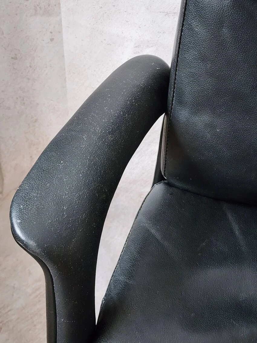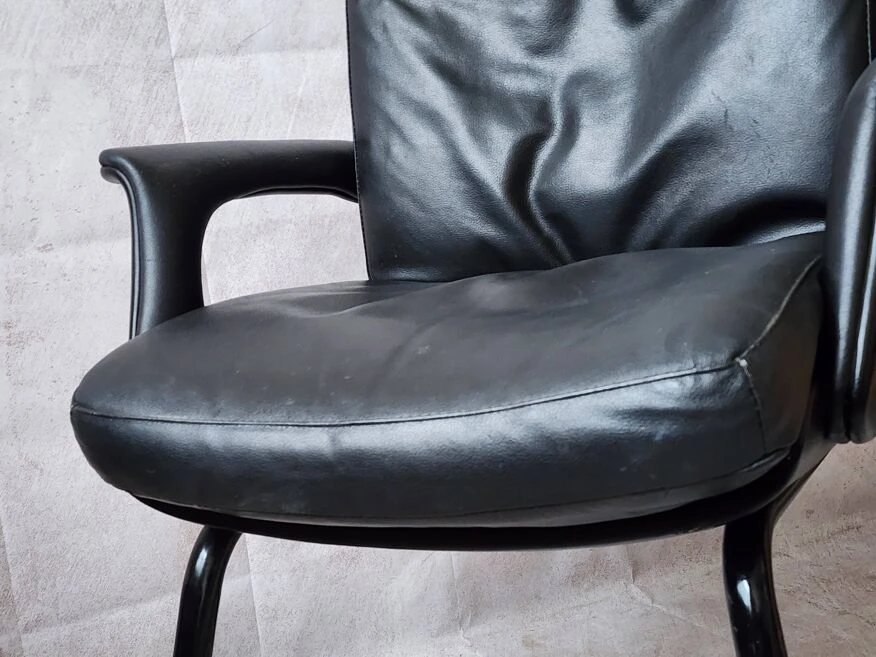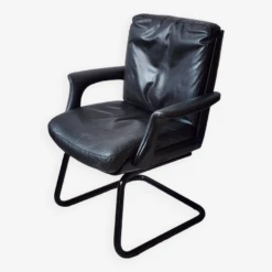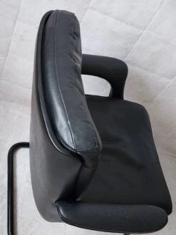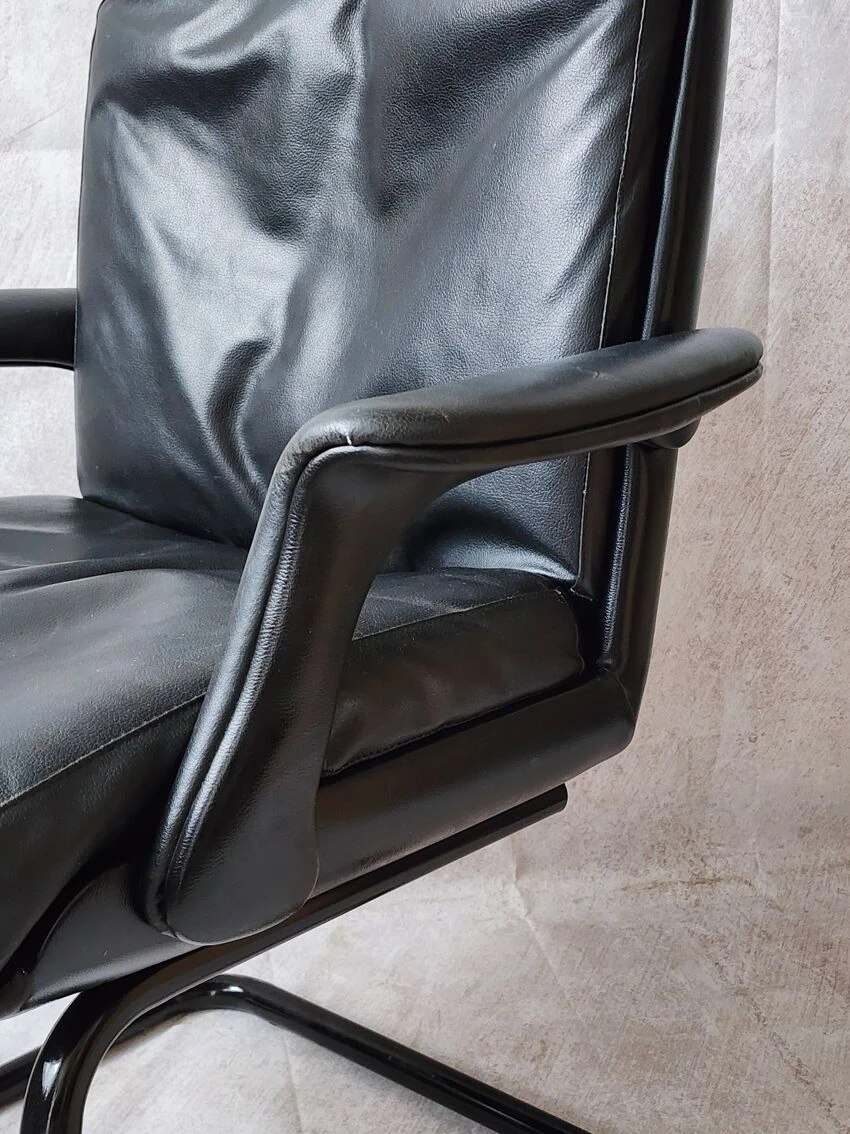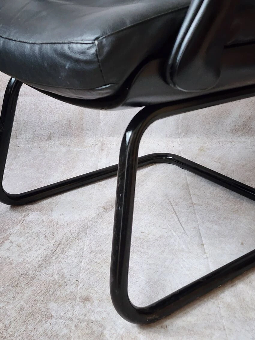 Armchair dating from 1993 produced by the Italian house zefla. It is a cantiliver armchair, which means that it does not have legs at the back, it is therefore cantilevered and therefore depends entirely on the physical properties of the materials in which it is made. This pioneering shape was made famous by certain designers including Marcel Breuer who experimented with this new shape with steel tubes. It is made of imitation leather and is particularly comfortable. Note some roughness on the left armrest (see last photo) seat height: 47 cm.