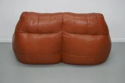 It was upholstered with brown/cognac patchwork leather and filled with polystyrene beads.