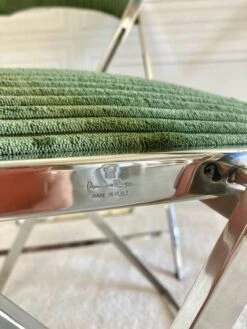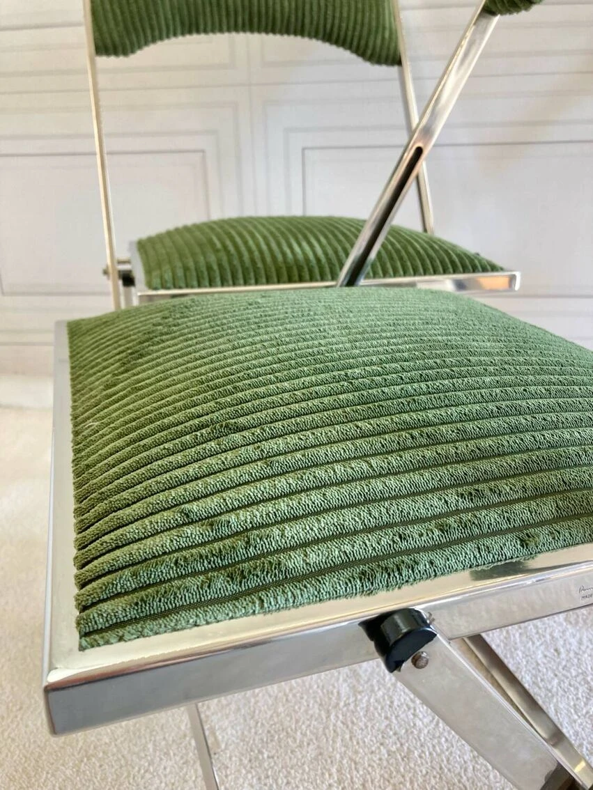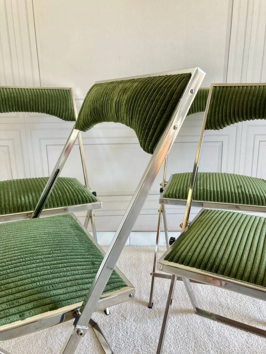 House Romeo Rega! Set of four folding chairs in chrome and green velvet. Dimensions; height 80cm, depth 47cm, width 45cm, seat height 45cm.