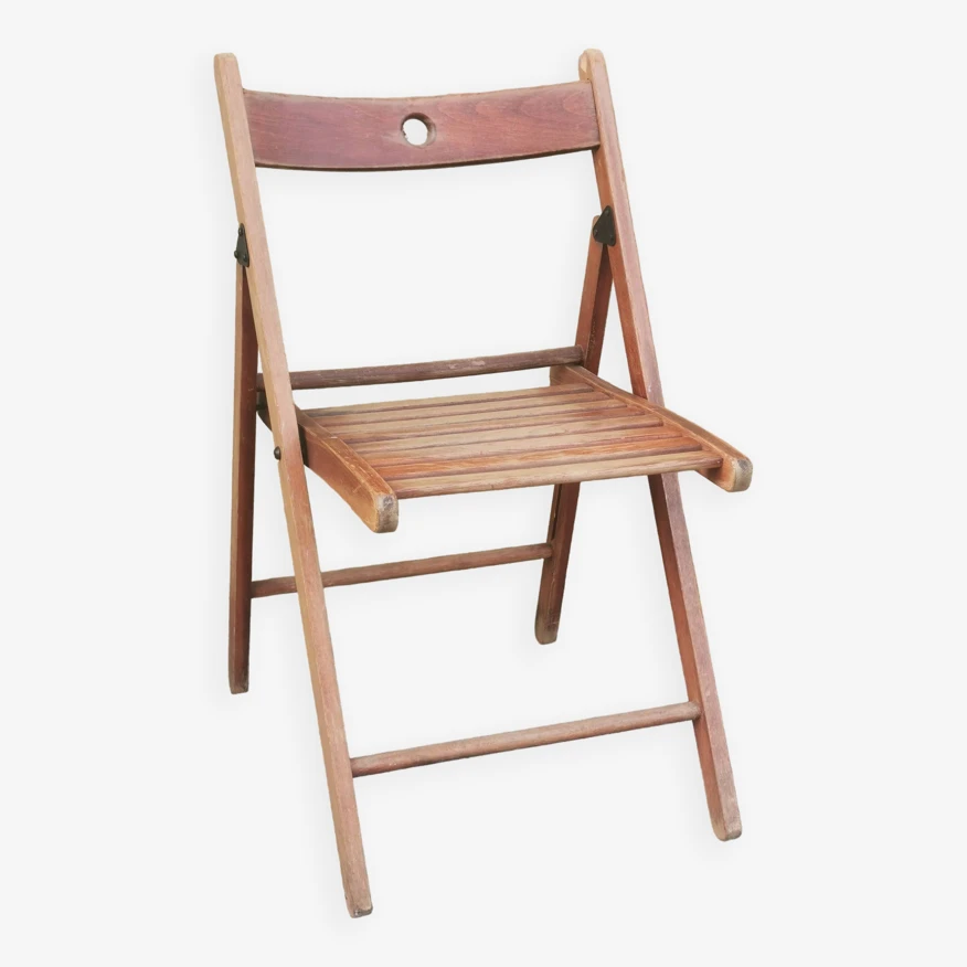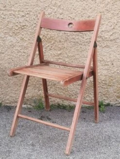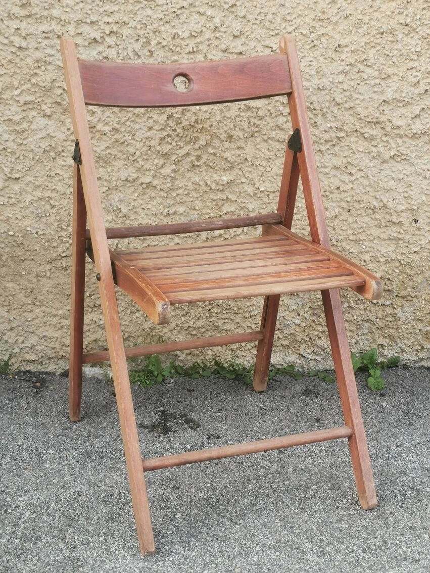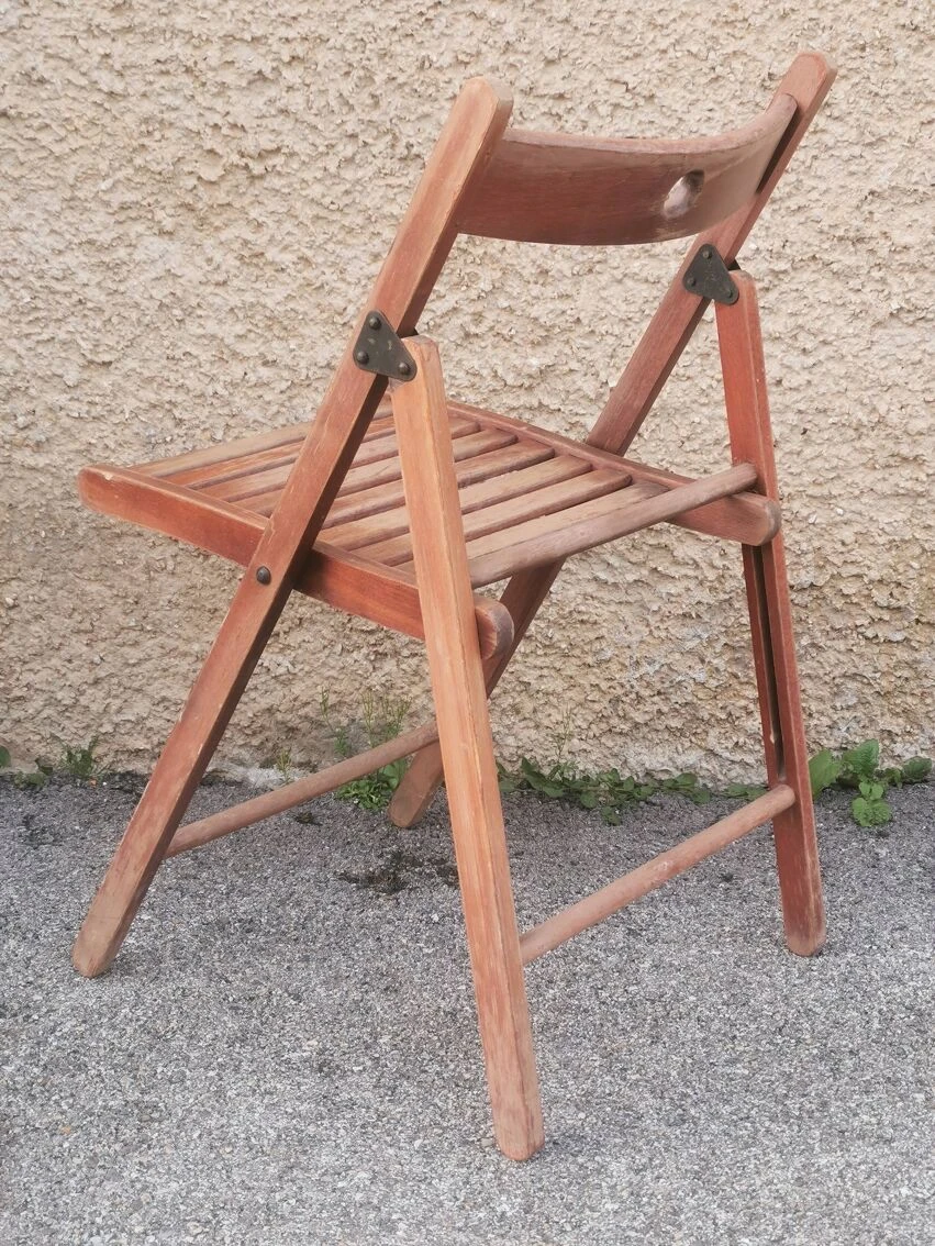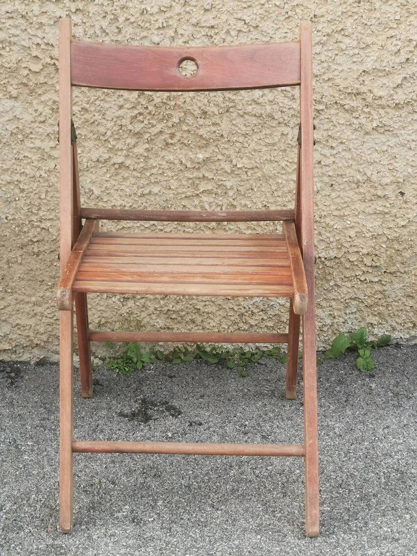 Vintage folding chair “scandinavian style” folding chair with scandinavian design, nicely patinated with its seat tilted backwards for more comfort back height 72 cm height from seat to floor 44.5 cm seat 38 X 40 cm in its original state it is stable, solid and functional.