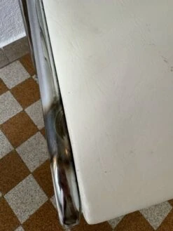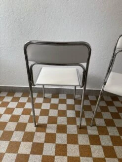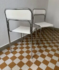 Beautiful pair of italian design chairs in chrome metal and white skai from the 70s; good general condition (some traces of time on the skai and on the metal, notably a trace of welding but overall clean!) height: 82.3cm seated height: 46cm width: 44cm depth: 40cm.
