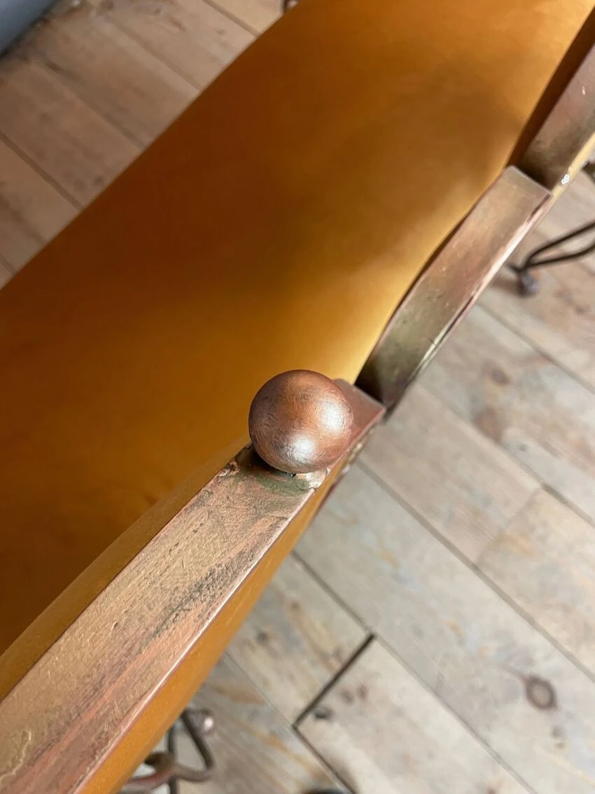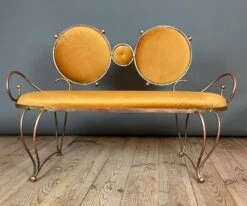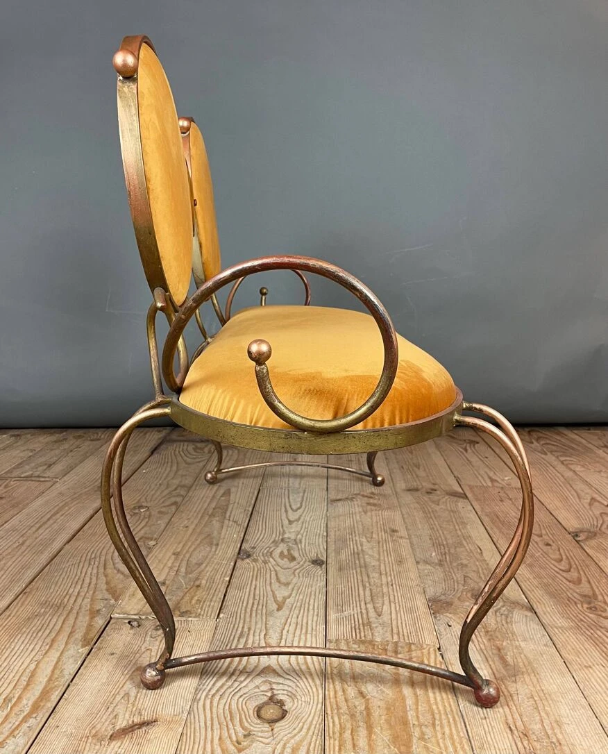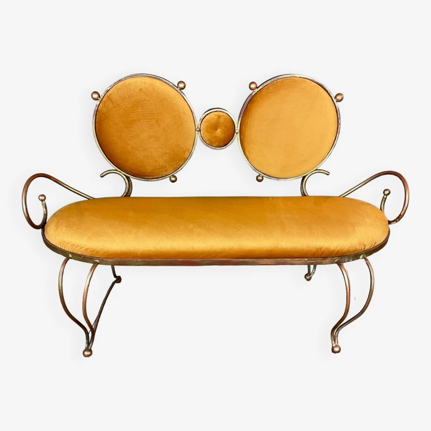 Wrought iron and gold-colored velvet sofa, 1980s in the Garouste and Bonetti style. This small sofa has been completely reupholstered so the seat is new. The wrought iron has been repatinated in gold and bronze colors. Heavy and well-made piece of furniture. Will find its place in a bedroom, living room or entryway. Dimensions: Length 135 cm. Depth 60 cm. Seat height 49 cm. Total height 91 cm.